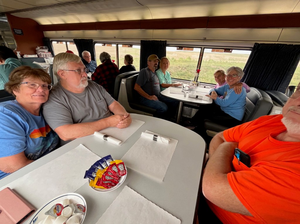 Finally towards evening, we secured two tables for all of eight of us traveling together in the Observation car, and played our family’s silly but fun dice game, “Greedy.” We had some great laughs.