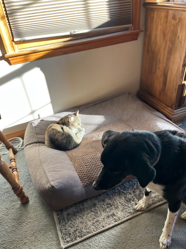 Pumpkin skedaddles to our bedroom (to get out of being in ‘the dog house’) and promptly starts cleaning herself, and then pretends to go into a deep sleep. Which she accomplishes pretty well. I do see her looking slightly exasperated at me when she hears me start up my vacuum.
