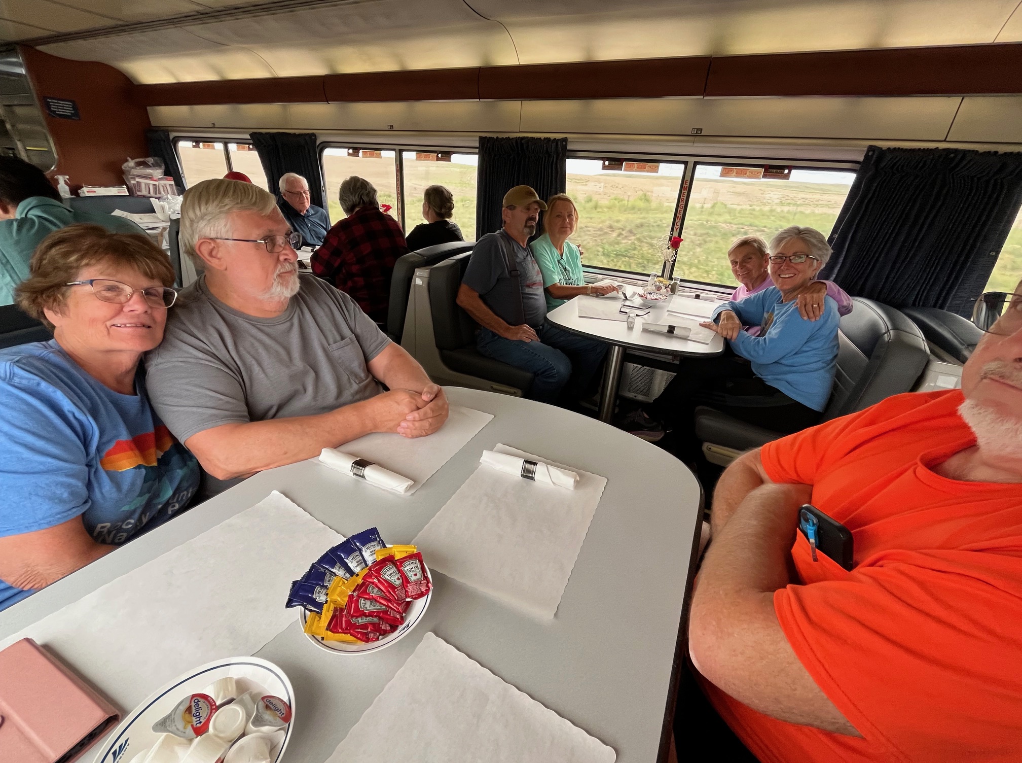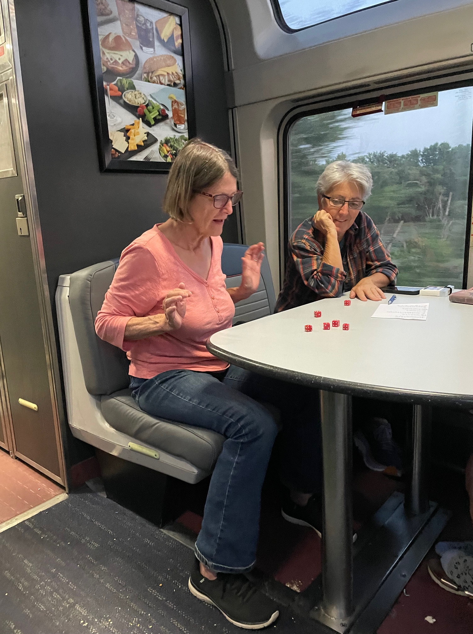 Finally towards evening, we secured two tables for all of eight of us traveling together in the Observation car, and played our family’s silly but fun dice game, “Greedy.” We had some great laughs.