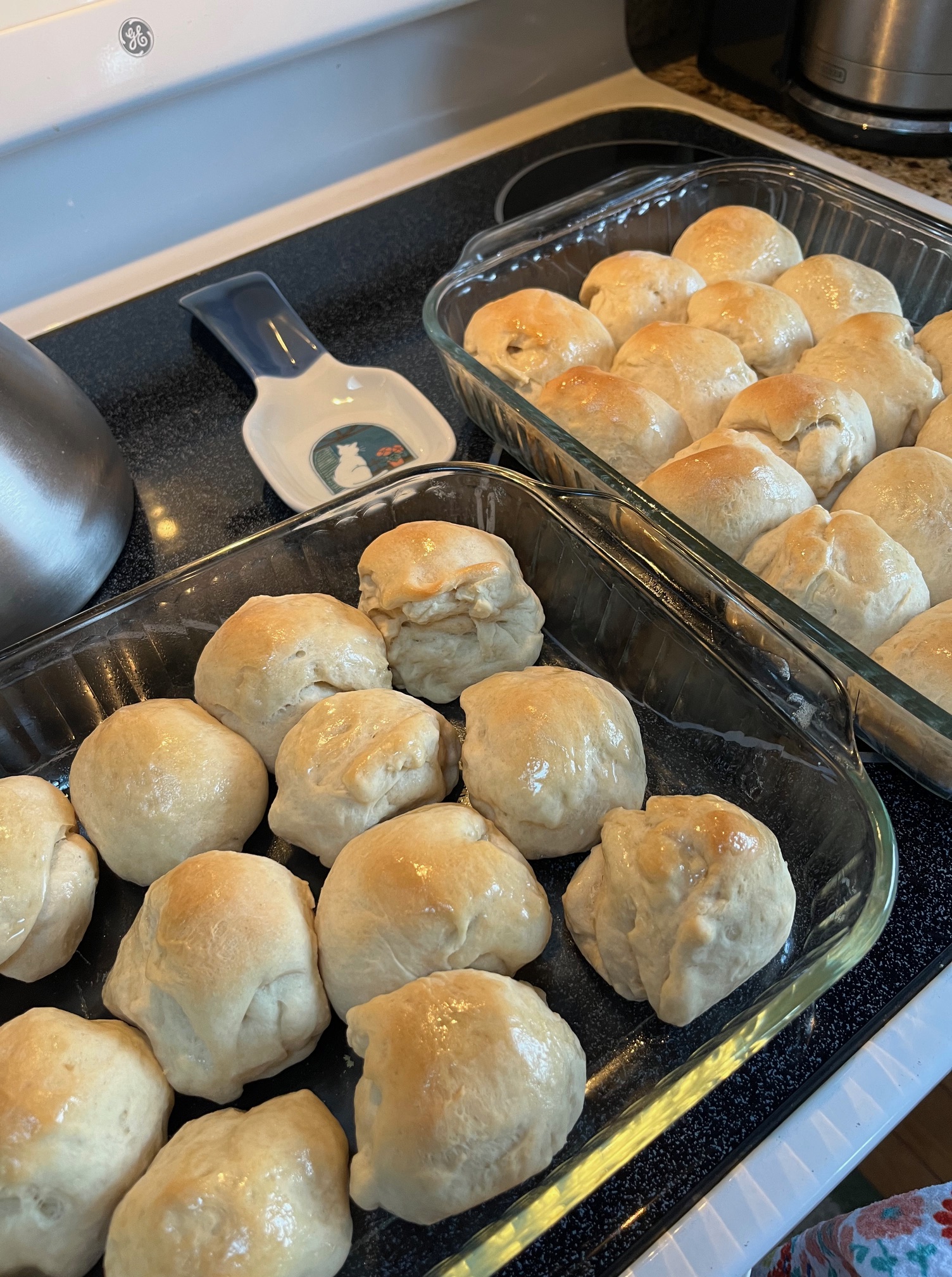 I have not made rolls or much of any yeast items for months, maybe even a year or two. I more often make instant-ish stuff, like sweet rolls out of a wrapped can of biscuits—which I douse with butter, brown sugar and cinnamon, and then after baking, top them with icing that I’ve mixed up with powdered sugar and cream. It worked for our family for a treat on Sunday mornings (when we used to be all home, five of us) and now after our Sunday morning yummies, my husband paces his share of the sweet rolls out for a quick breakfast treat the rest of the week, one day at a time.