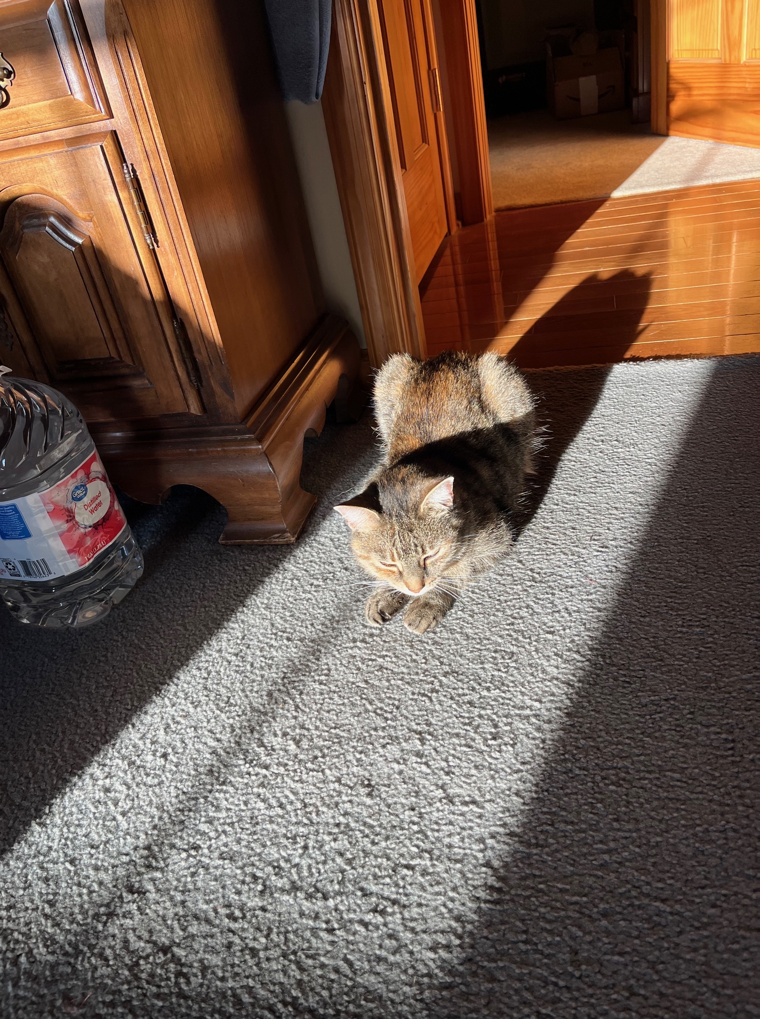 Pumpkin skedaddles to our bedroom (to get out of being in ‘the dog house’) and promptly starts cleaning herself, and then pretends to go into a deep sleep. Which she accomplishes pretty well. I do see her looking slightly exasperated at me when she hears me start up my vacuum.