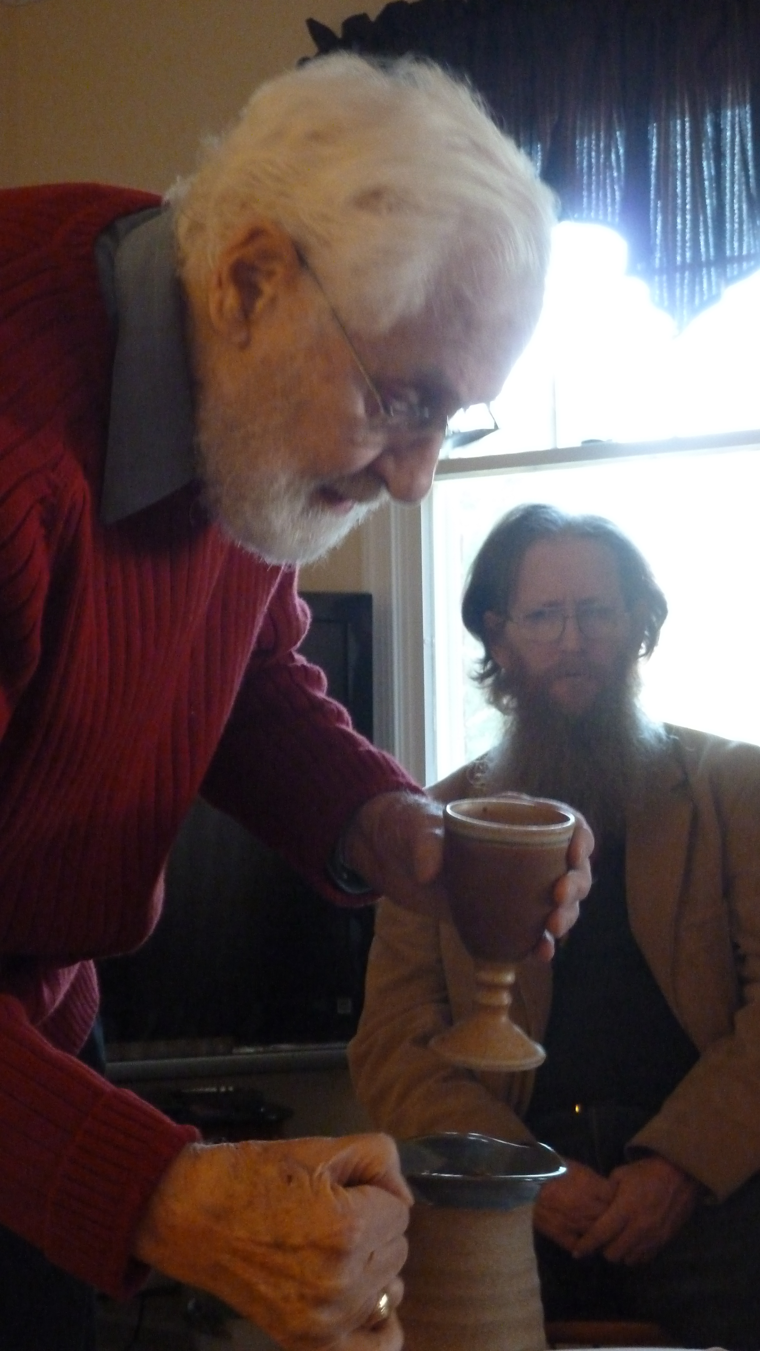 We are fortunate to have an ordained minister to lead communion in our small group. In groups that don’t have a minister as a member (and we have lots of retired ministers at our church), the installed pastor sometimes visits if communion is desired. Each person serves the next one. (In Presbyterian circles, a clergy person almost always leads the Lord’s Supper.)