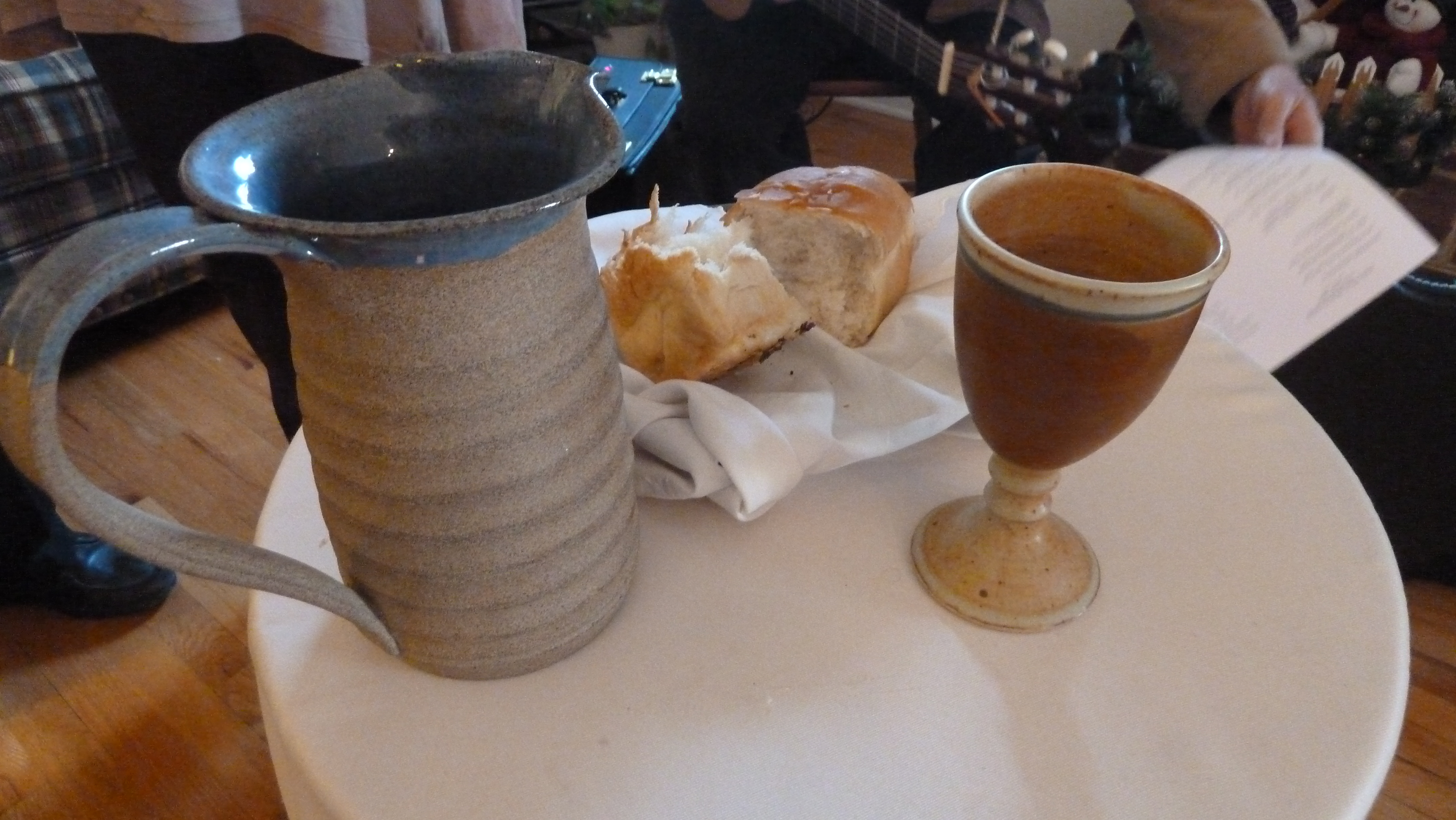 In today’s service, Don starts communion by recalling how when Trinity was first beginning and they began to practice communion in homes like the original disciples, he remembers how elderly Mrs. Funkhouser kept the communion leftovers on her table in her breakfast nook for a whole week before cleaning it up, because she was so awed by the idea of having that special meal in her home. Don reminded us that our simple table today is the same meal commemorated in huge cathedrals all around the world in much fancier surroundings, and the same meal Jesus served.