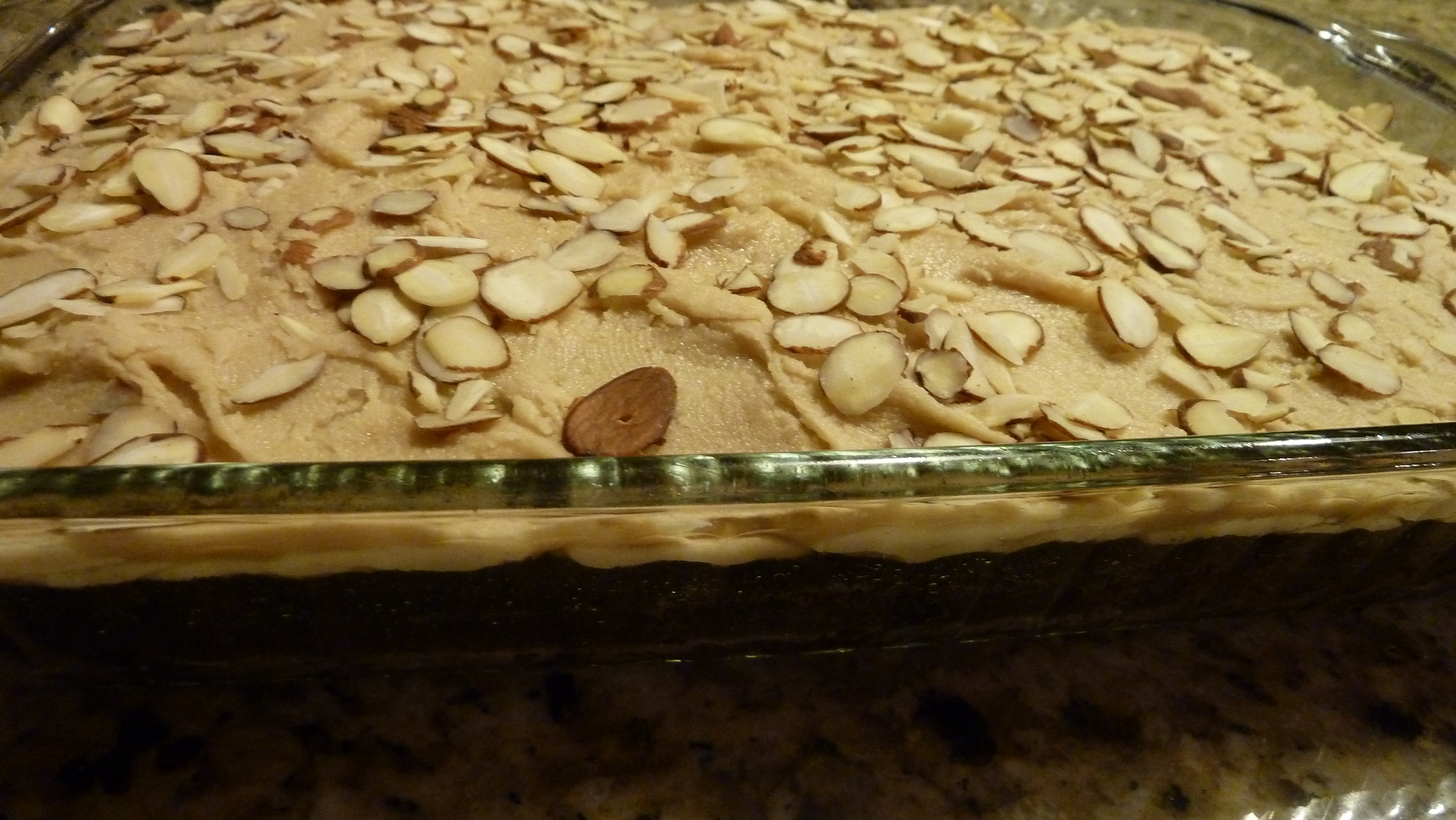 The cake is rich, moist and good all by itself, or with chocolate frosting or a white frosting–for which there are also recipes in the book. This time I added slivered almonds which makes the whole thing like a candy bar. I know, sinful, especially during Lent. But tomorrow is feast day!