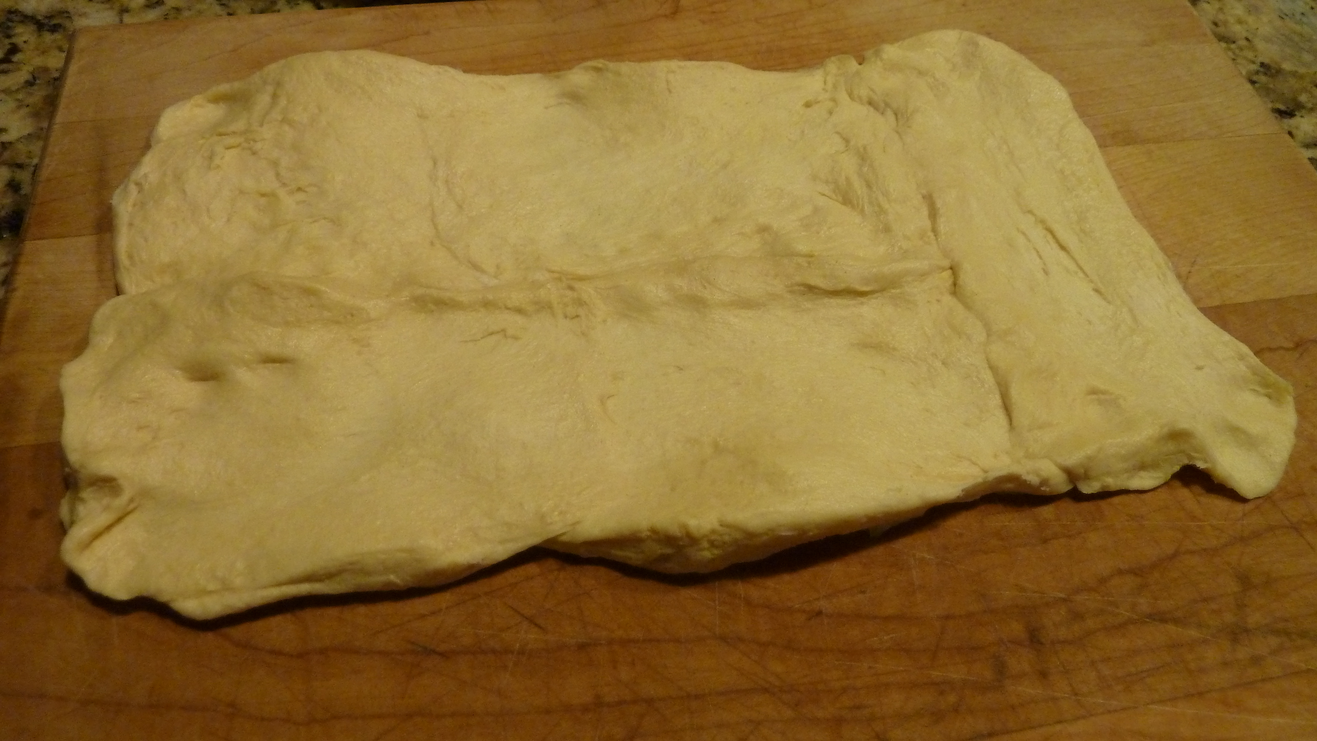 Roll up the dough, slice into 5-7 pieces. Place close together in pan, even if you only use half the pan, so the rolls rise up together and keep their sides from becoming baked and hard.