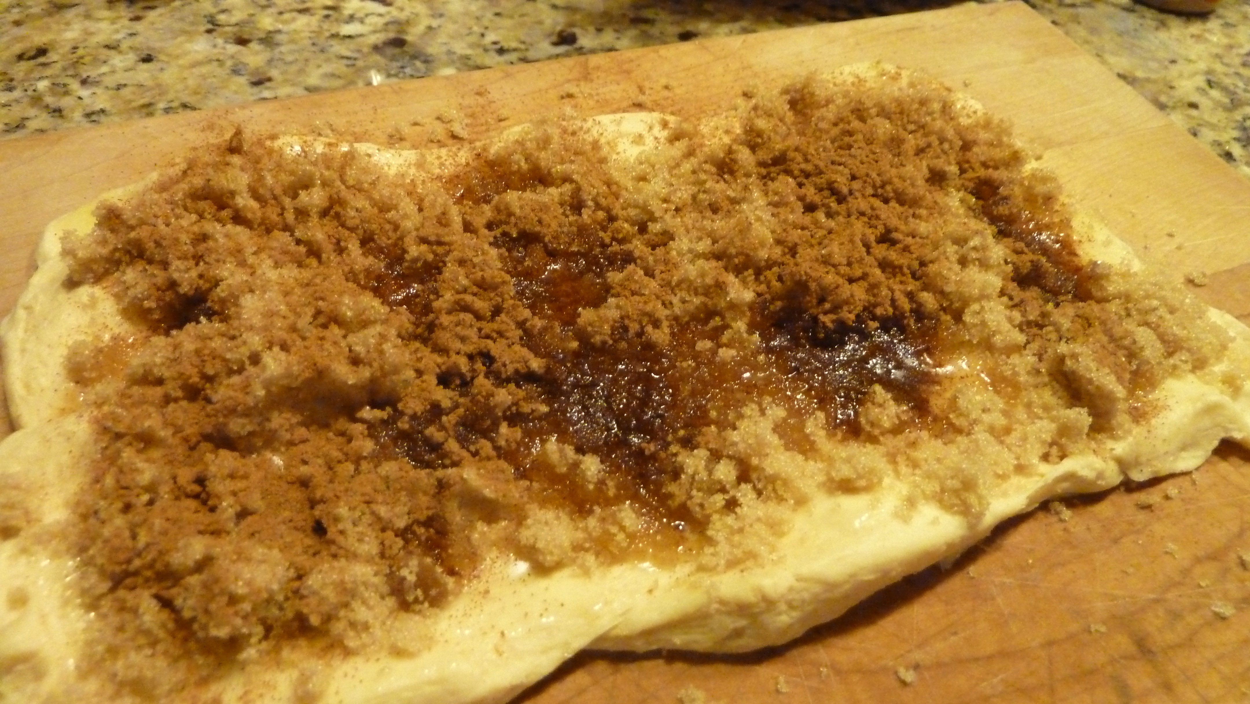 Spread melted butter, brown sugar, and cinnamon on the dough.
