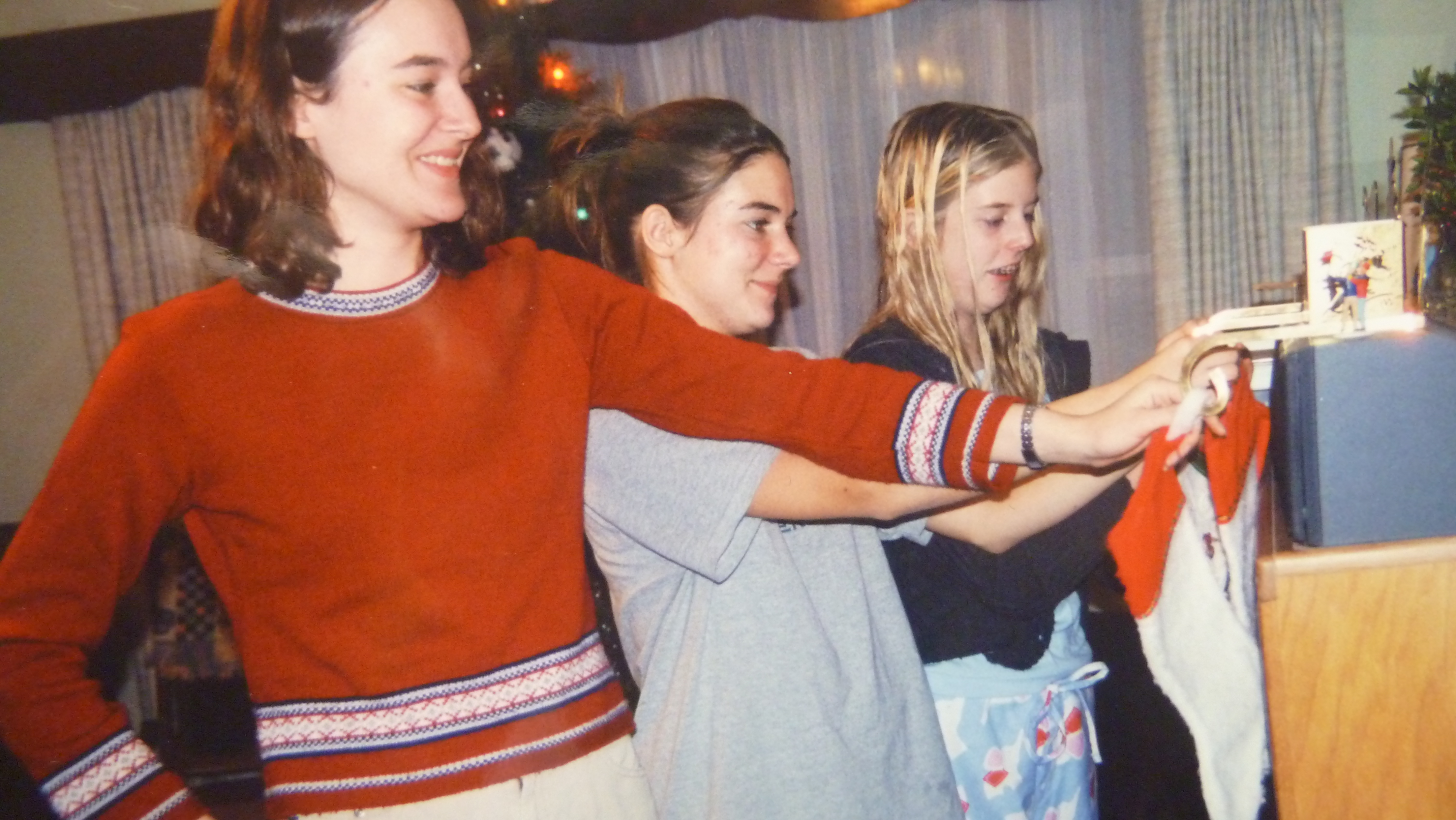 Hanging Christmas stockings is more fun with three. T-shirts found at the Shipshe Flea Market. All grown up at middle sister’s wedding, 2011. Wedding photo courtesy of Richard Davis. (Note how many of my photos have the daughters in the same oldest, middle, youngest sequence.)