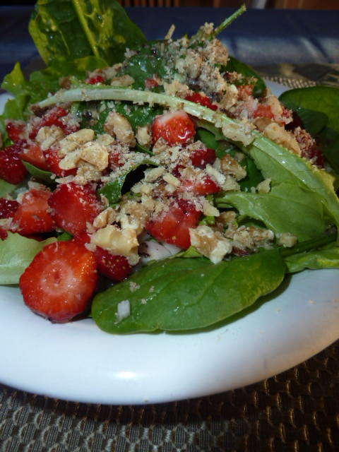 Here’s a simple salad perfect for the mid-Atlantic region in May when fresh strawberries are coming on, and some greens from the garden, and maybe some radishes. Add some nuts, crumbled feta cheese or other, and Kimberly’s simple but tartly tangy dressing and you have an awesome lunch or dinner side dish.