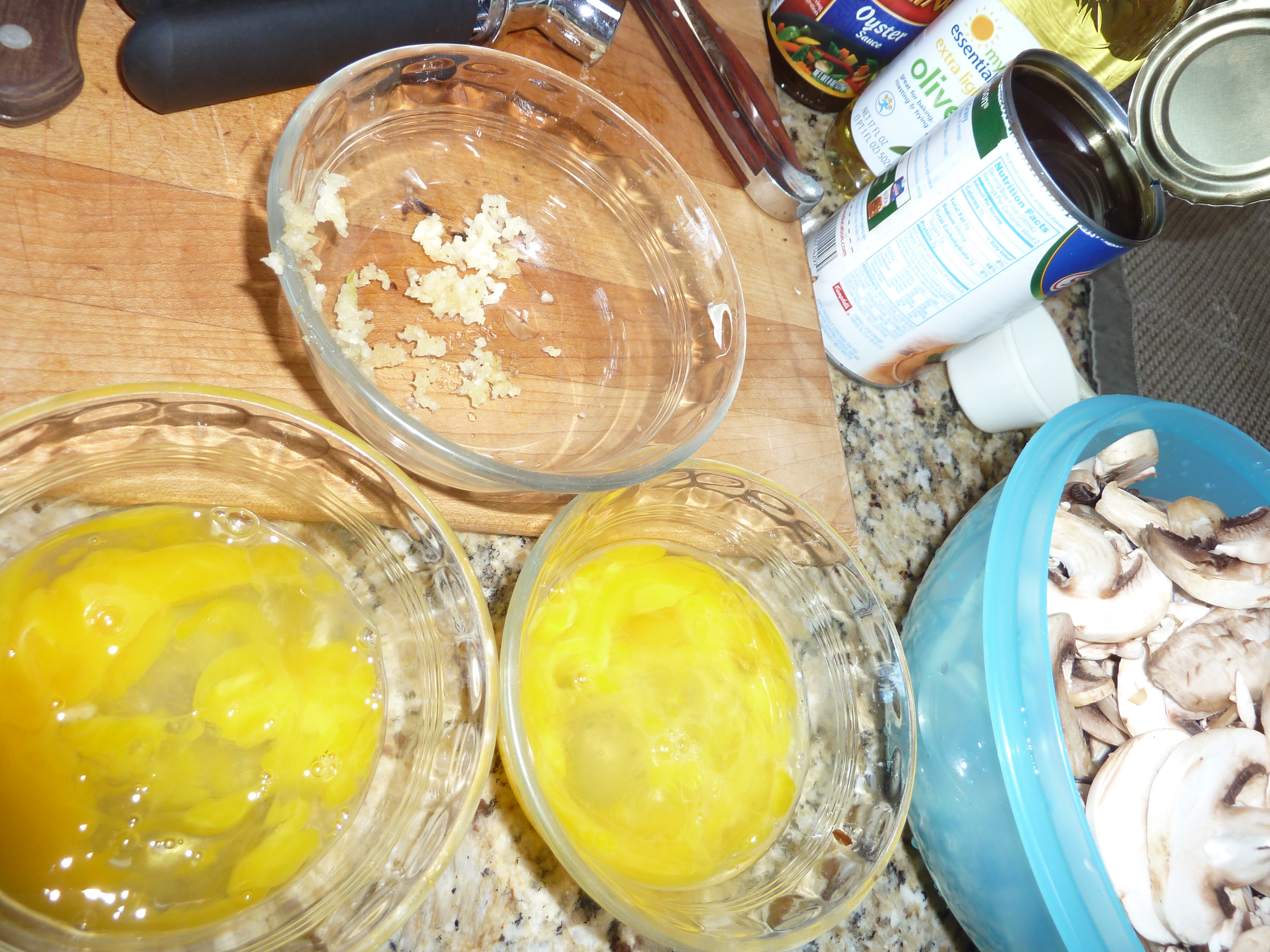 Heat oil and sauté garlic for 1 minute. Add 2 eggs and whisk. Add mushrooms and stir. Add bouillon, sugar, oyster sauce, and 3rd egg and stir continuously until the egg is fully cooked. (Total cooking time, not more than 10 minutes. Have rice ready to serve.)