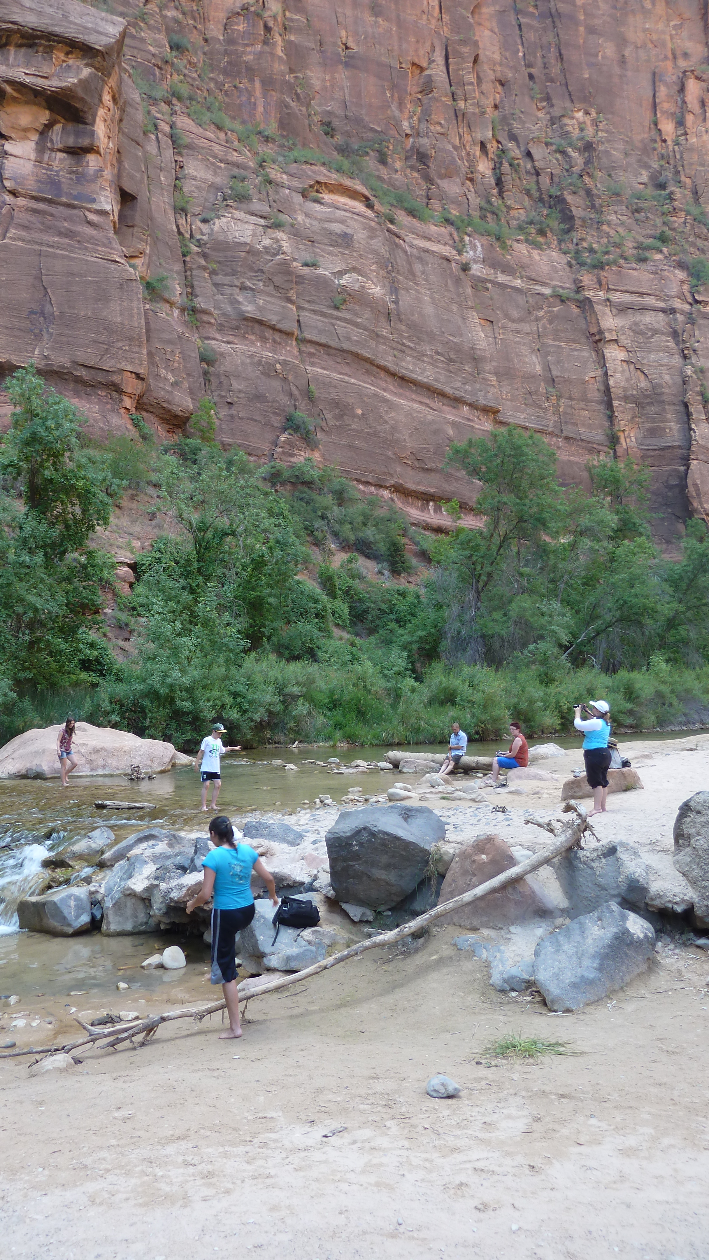 We were able to follow Riverside Walk back what they call “The Narrows” where the canon gets, obviously, more and more narrow and the coolness of the rock allows climbers to test their endurance up its walls—and we were able to spy one such on a distant wall. Our own hike was not strenuous but I loved being able to really see some of the inner depths of the park. My park brochure says that “stratigraphy, the study of rock layers, reveals rocks formed in environments as varied as sand dunes and shallow sea bottoms.” The various layers of colors and lines all have significance in Zion.