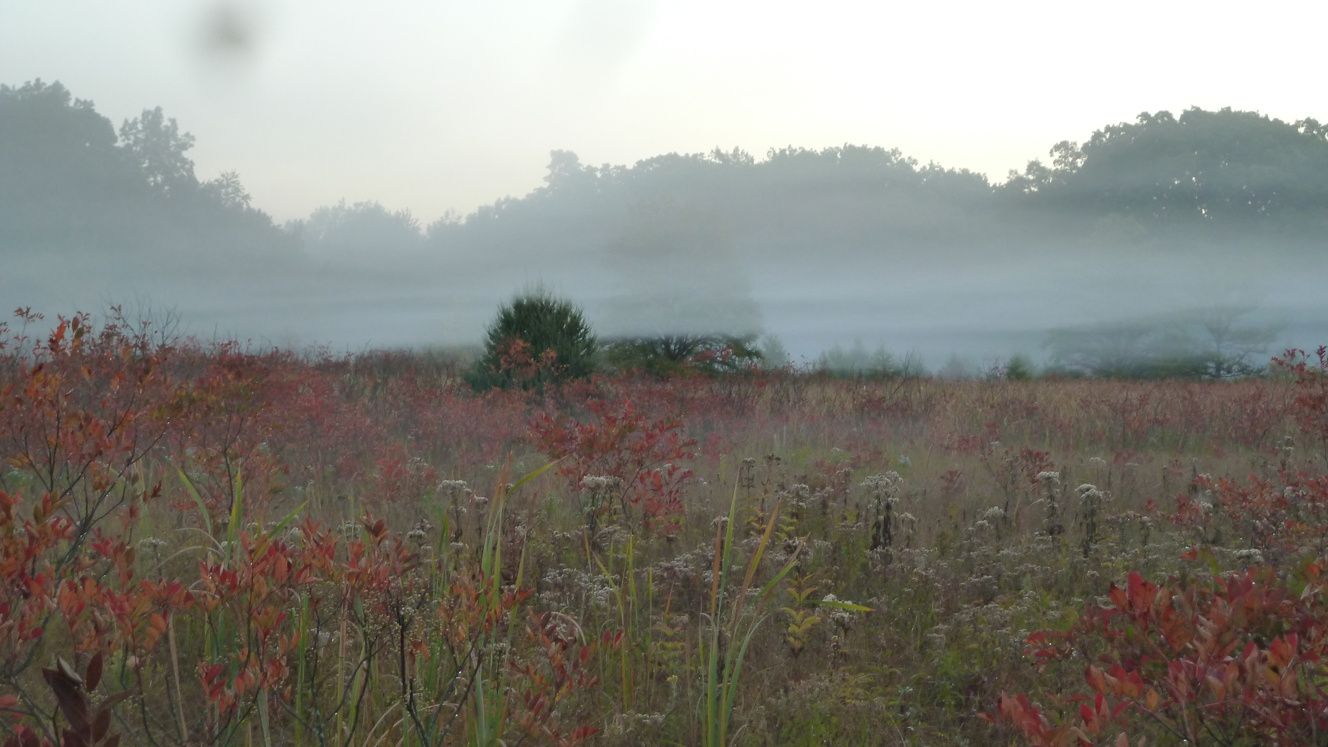 Early morning mist shrouding wetland.