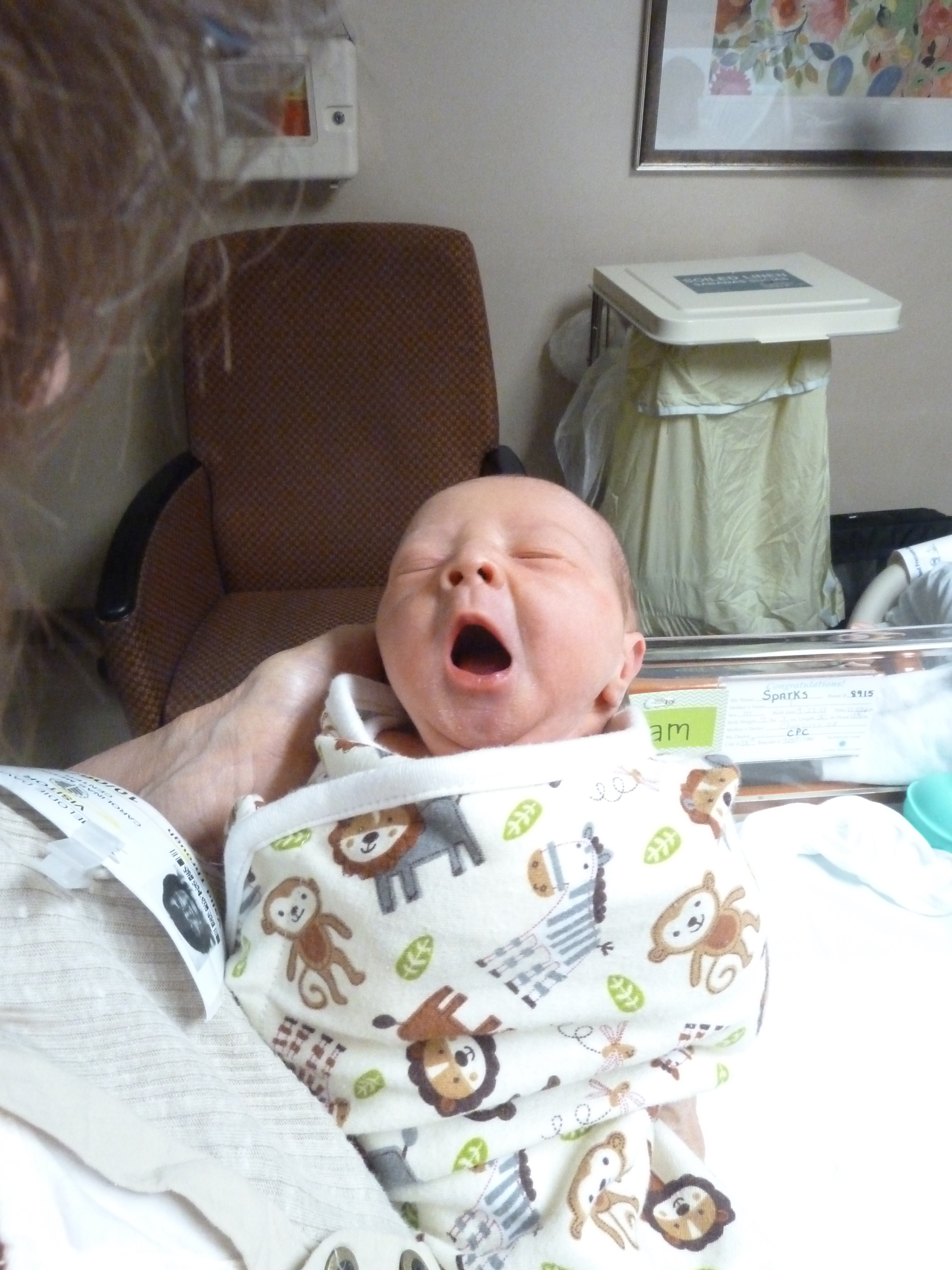 Sam was and is beautiful, a handful of hungry tummy and increasing lung strength, who did everything babies are supposed to do: squirm, grimace, make wonderful faces, yawn, sleep, nurse (open tiny mouth wide!), wet and dirty his diapers, snuggle, wake his parents too much at night. Suddenly I was thrust back into early nursing woes and pain and feeling like you’ll never get enough sleep again.