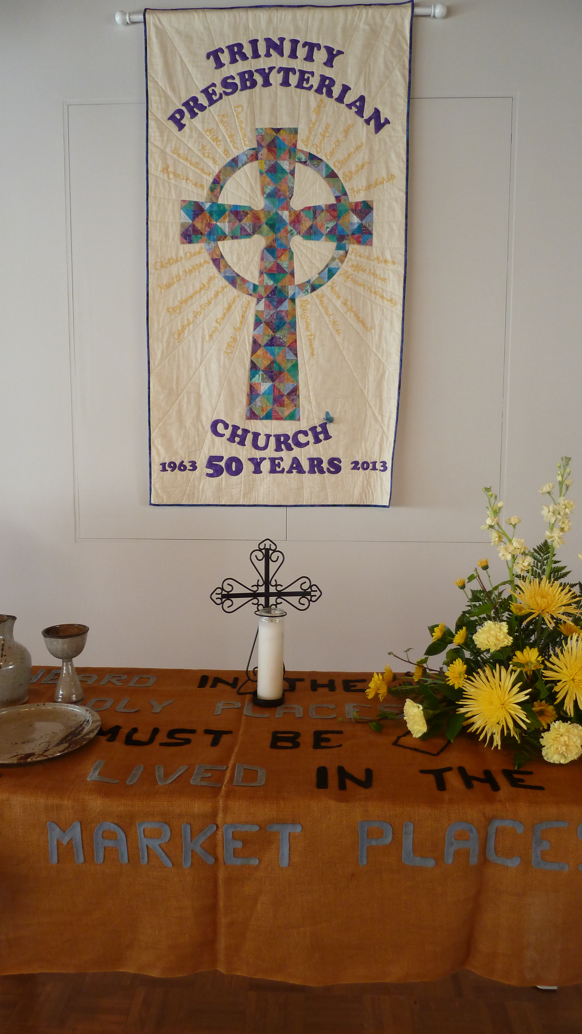 New banner made by lifelong friends Susan, Ginny and Page. Altar cloth is one of Trinity’s first ever banners of burlap, for the Marketplace House Church which ran a coffee house near Court Square in Harrisonburg for many years.