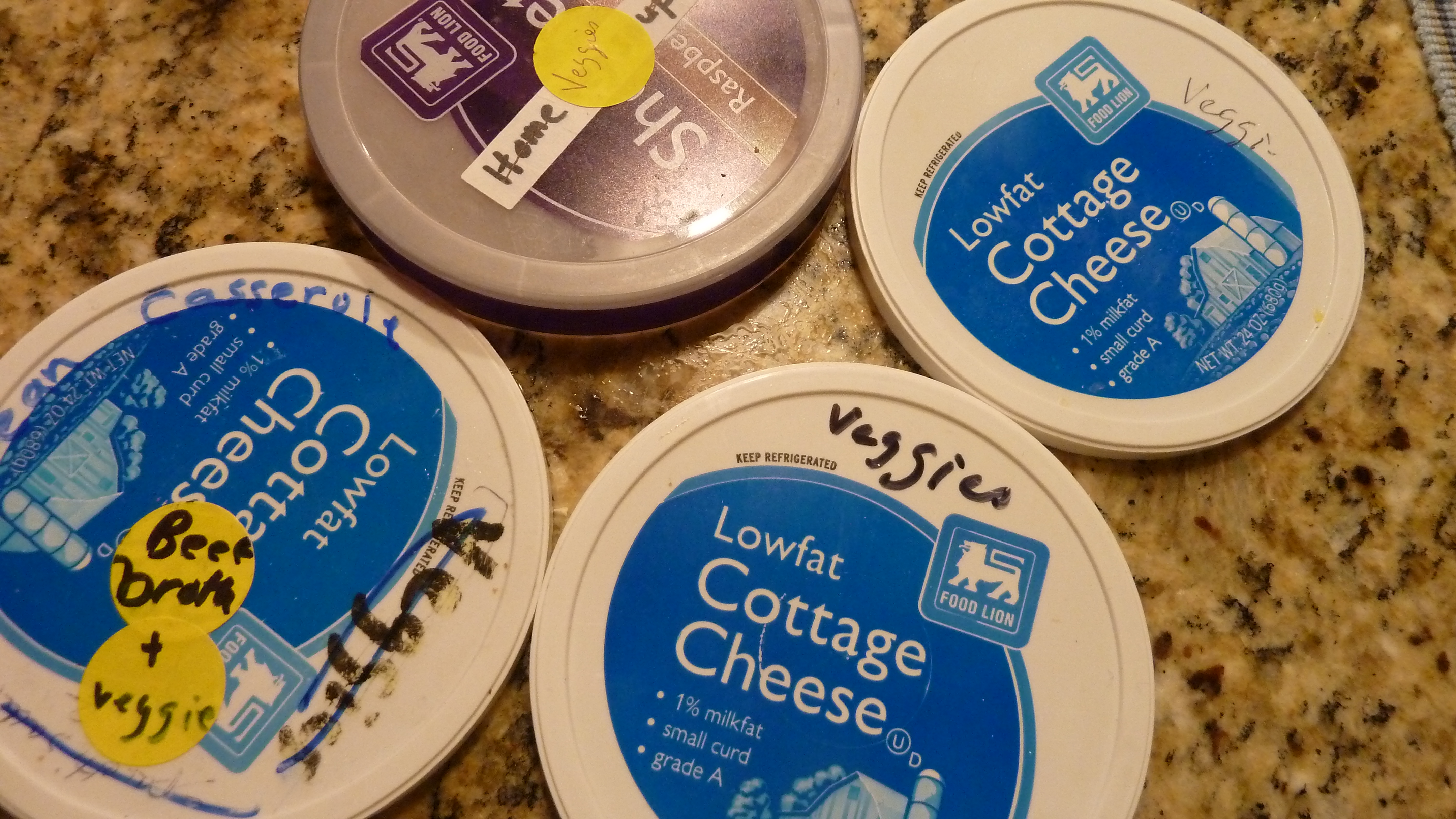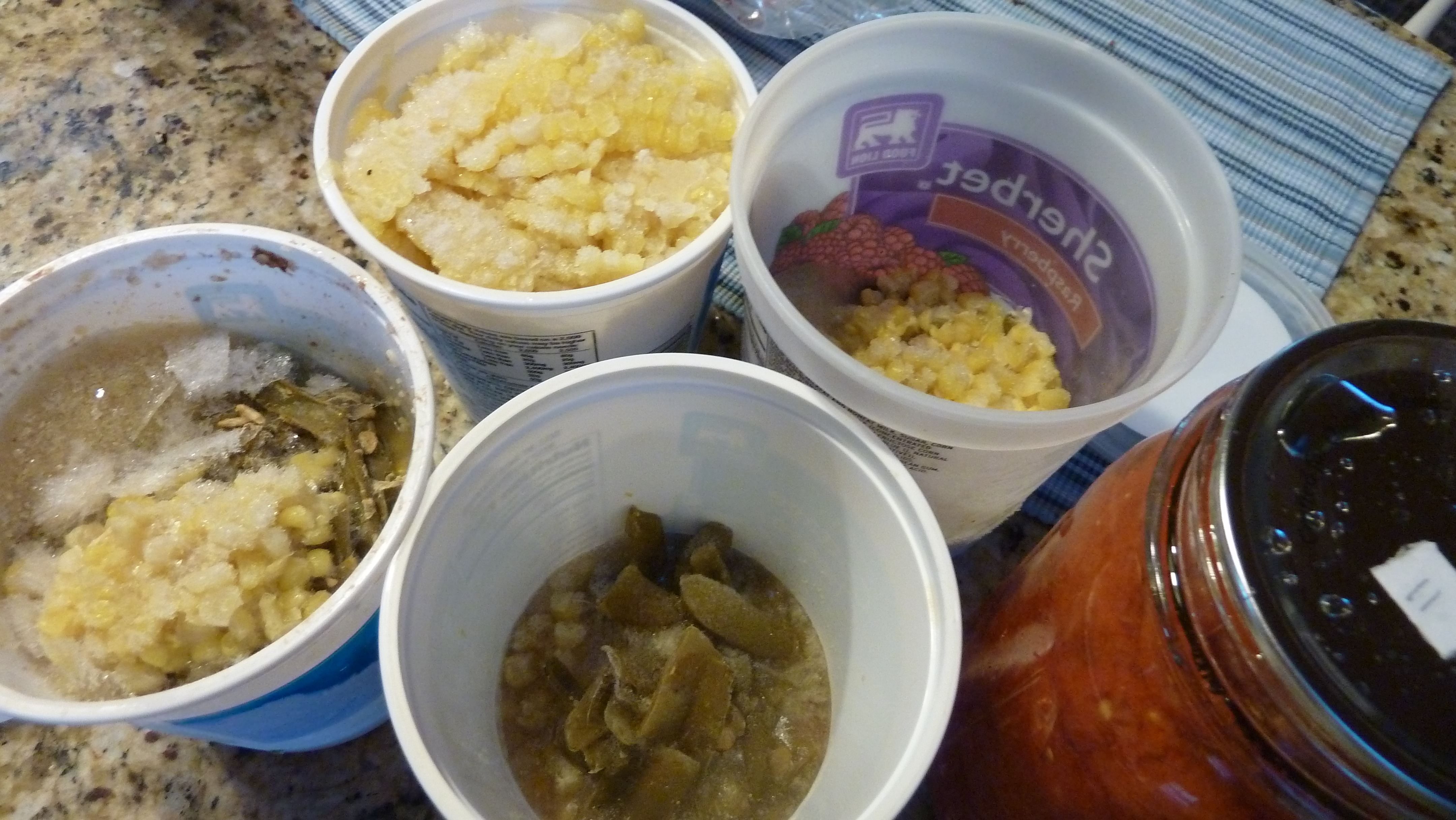 1-2 quarts canned or frozen vegetables, or leftovers you have frozen: corn, peas, green beans, lima beans
