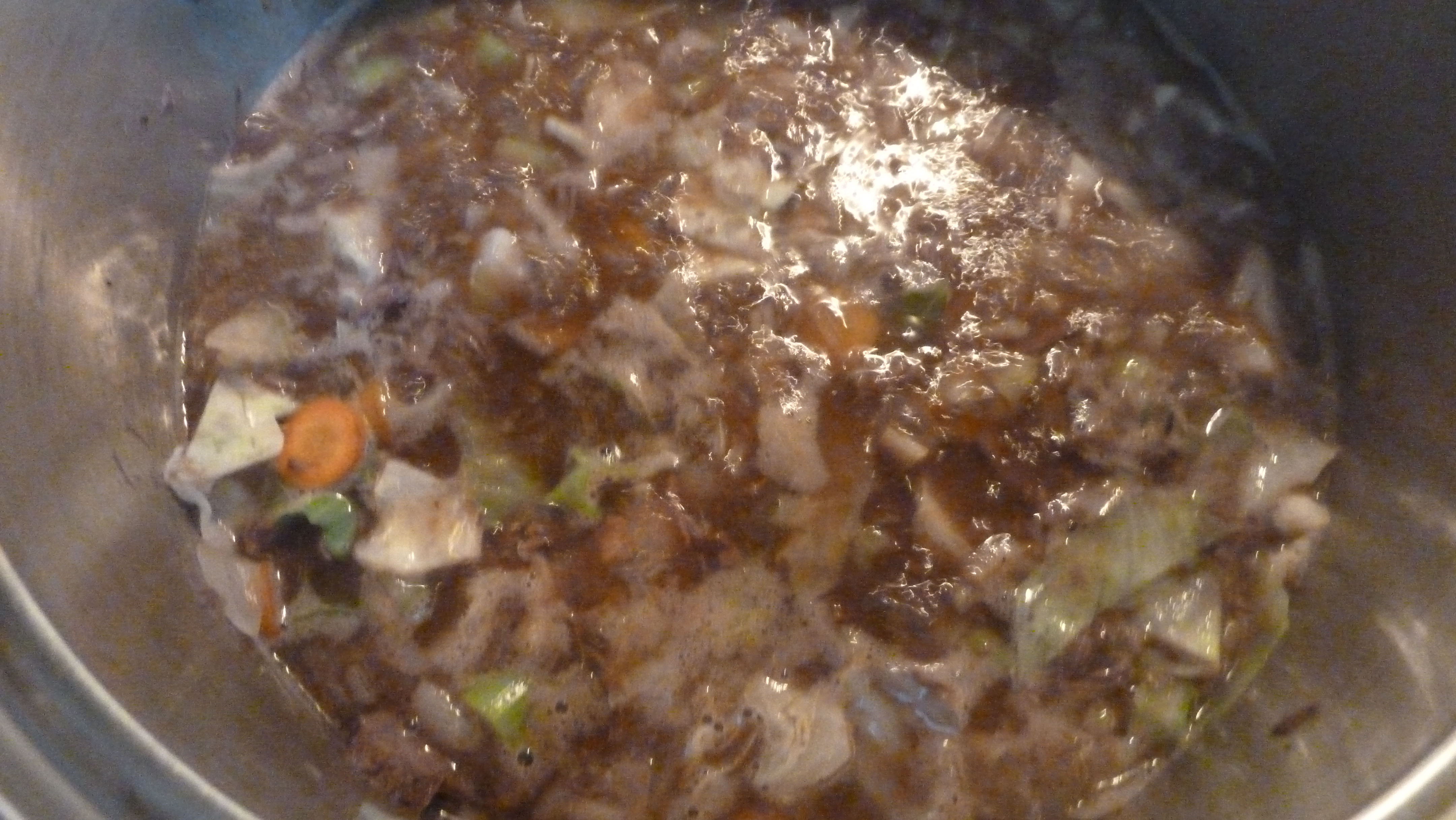In 5 quart Dutch oven or other large kettle, brown diced stew meat in oil 5-10 minutes. While that’s browning, chop potatoes in small cubes, slice carrots, celery, chop cabbage. Set aside. Add tomatoes and then all raw vegetables to the meat.