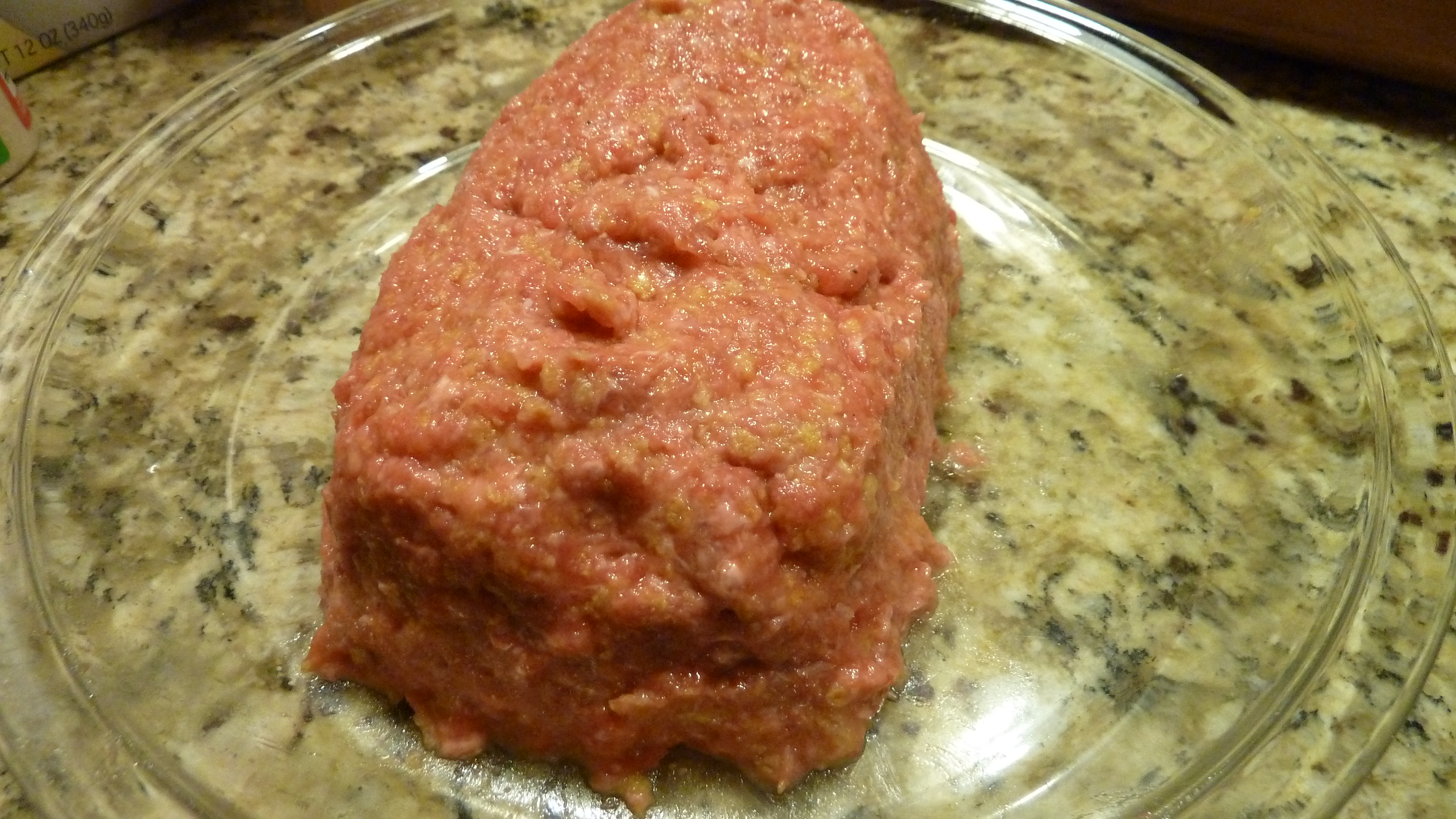 Place ball of meat in a baking dish or pie pan and form into loaf shape . Bake at 375 degrees for one hour. Slice and serve.