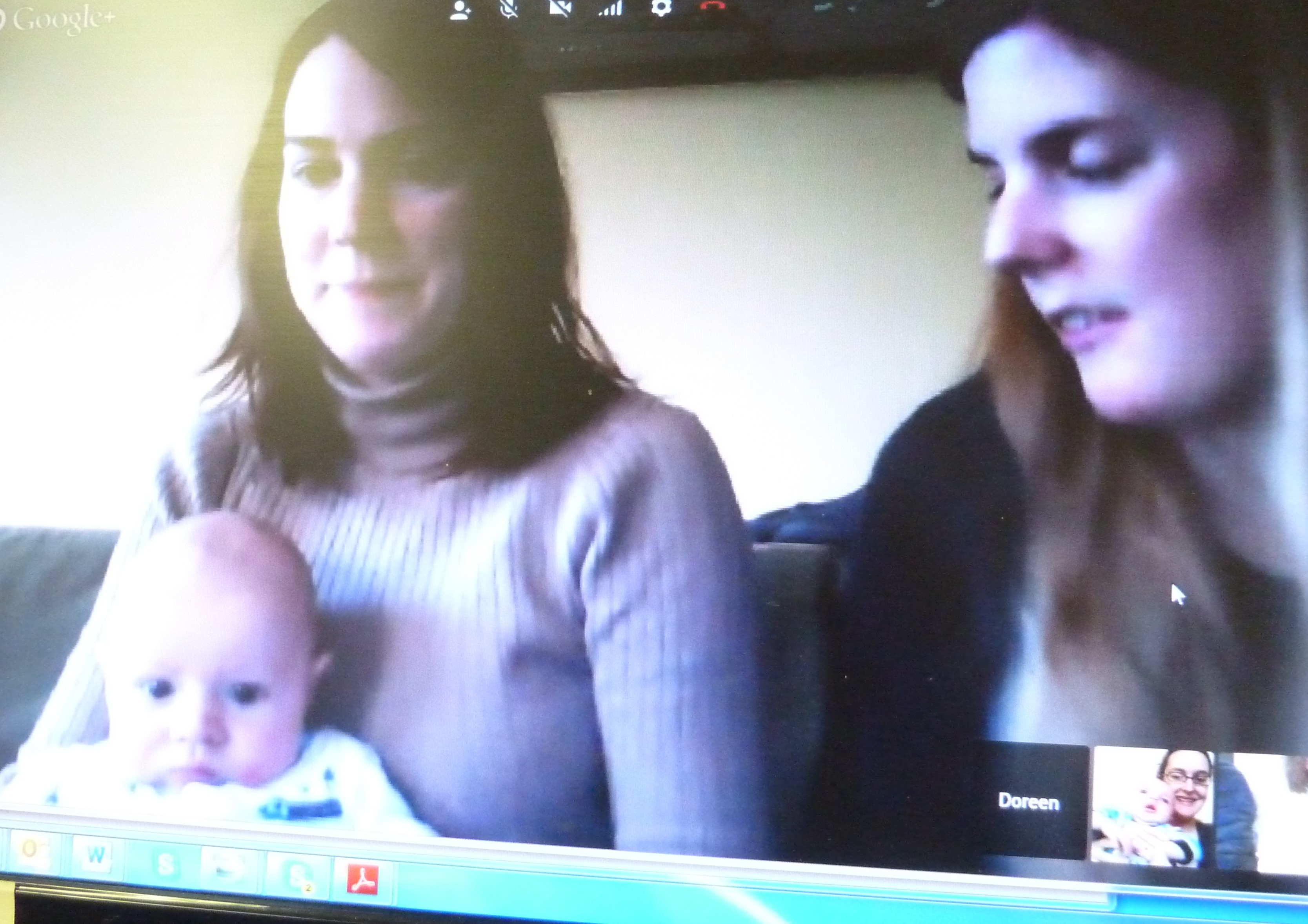 This past Sunday was the first time we all got together from three locations which isn’t easy to schedule, even then. For one, we don’t have a fast enough Internet connection at home for reasonable video hook up so we have to be in town at my office. The hitch on the other end is babies who are not nursing, not napping, and in a relatively happy mood.