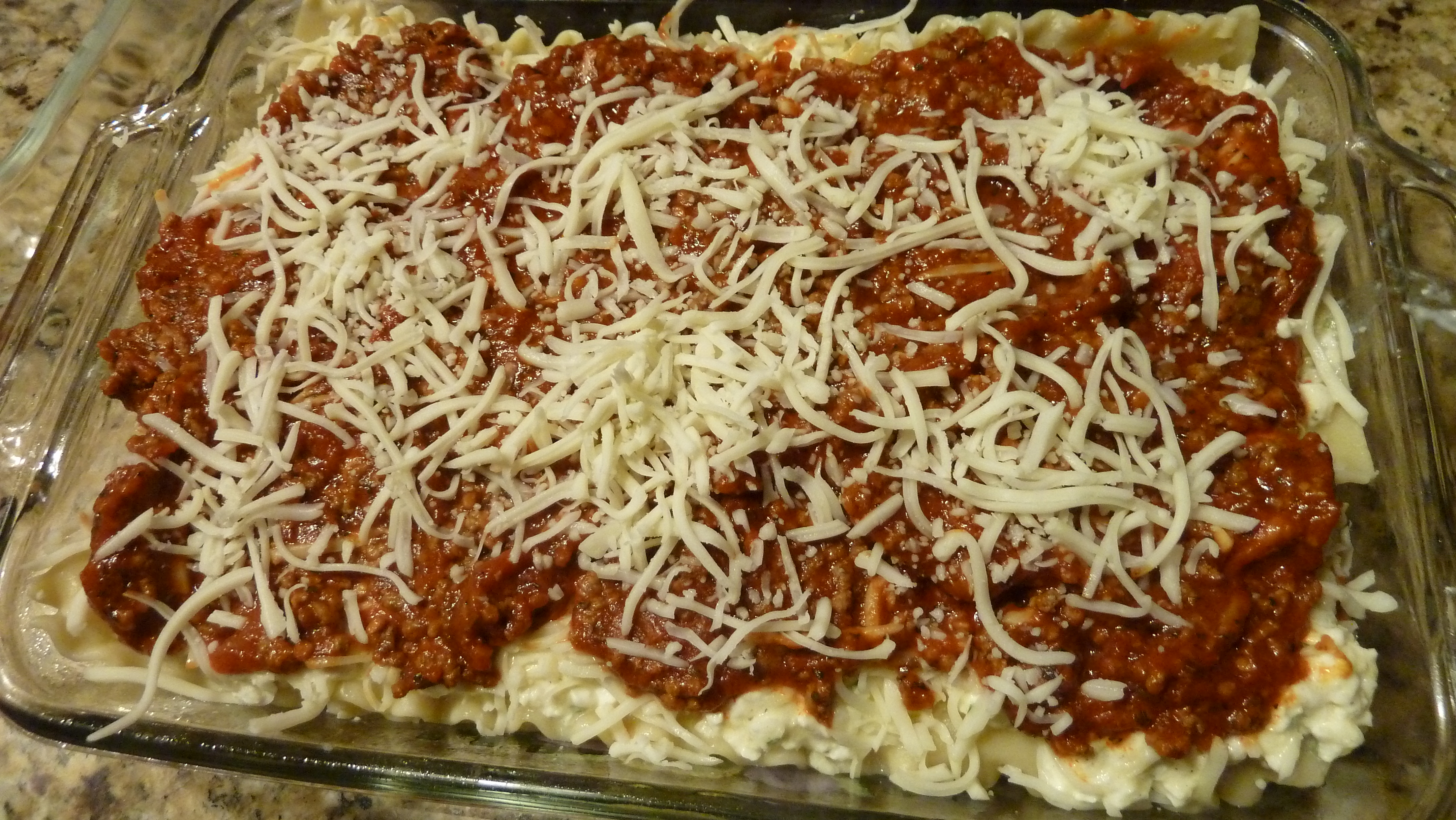 Note: If you use a 9 x 13 inch pan, you get one dish of lasagna, and likely have about 5-6 noodles left over. I hate wasting them. So usually instead, I use extra mozzarella and make plenty of meat sauce and just spread the cottage cheese mixture out further to make at least two, maybe 3 pans of lasagna.