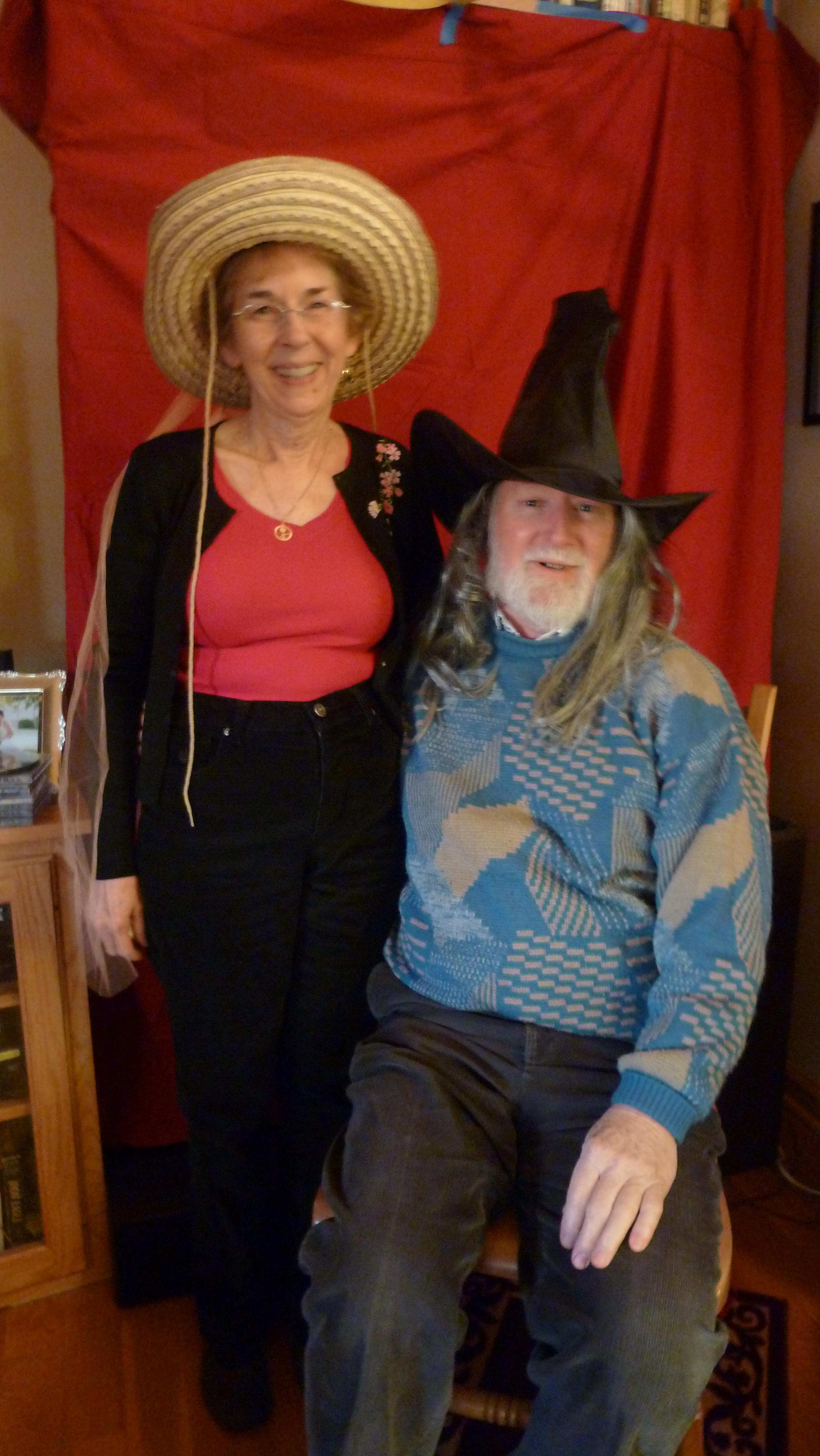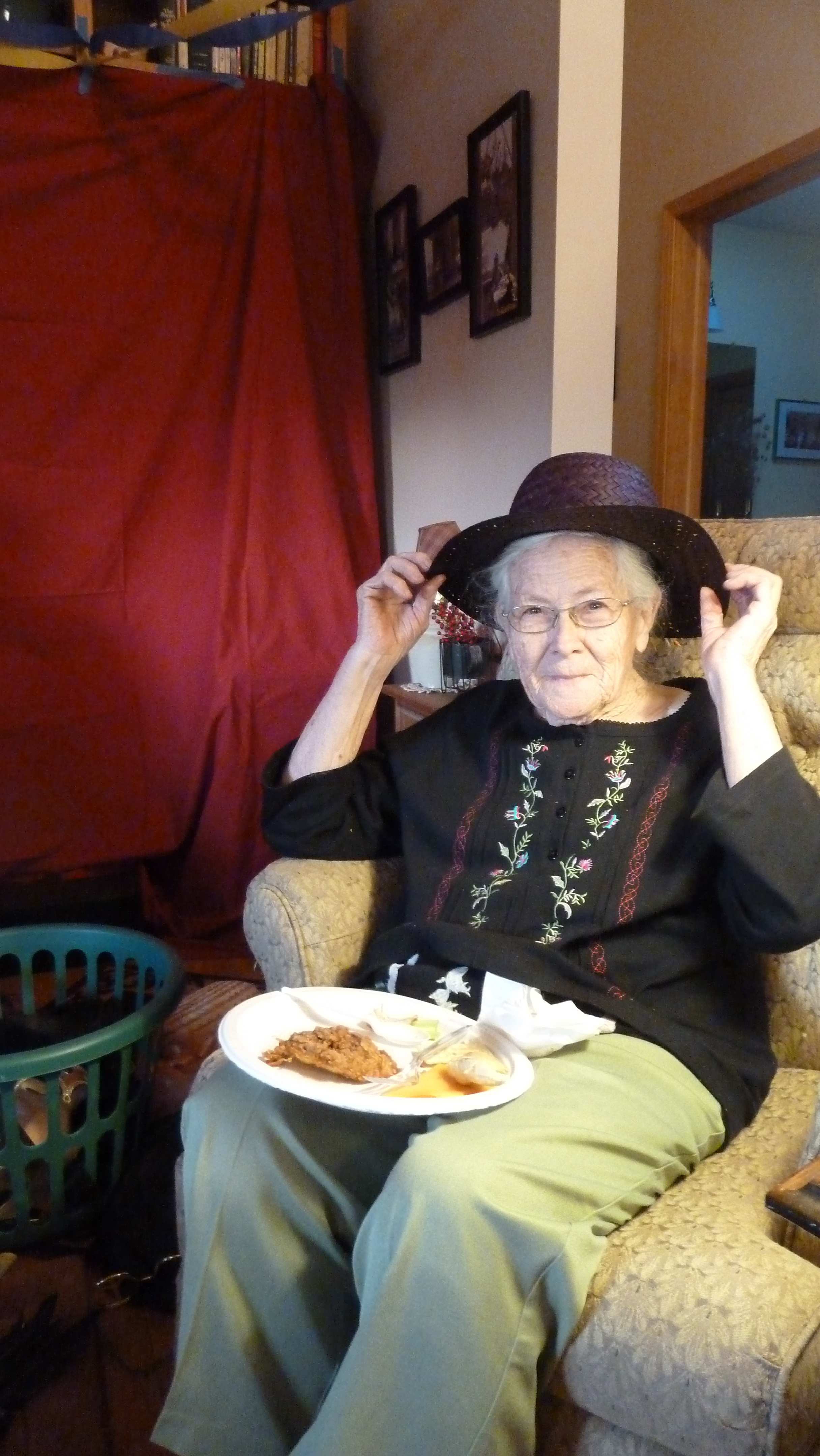 Photo Booth. I’ve never actually seen a photo booth at a lawn party either but this idea was kind of culled from amusement parks where you can dress up in old style clothing. So two daughters brought props and I combed the attic for old musical and Halloween costumes. Some guests seemed to enjoy hamming it up a little for the camera. Especially Abby and Jaiben.