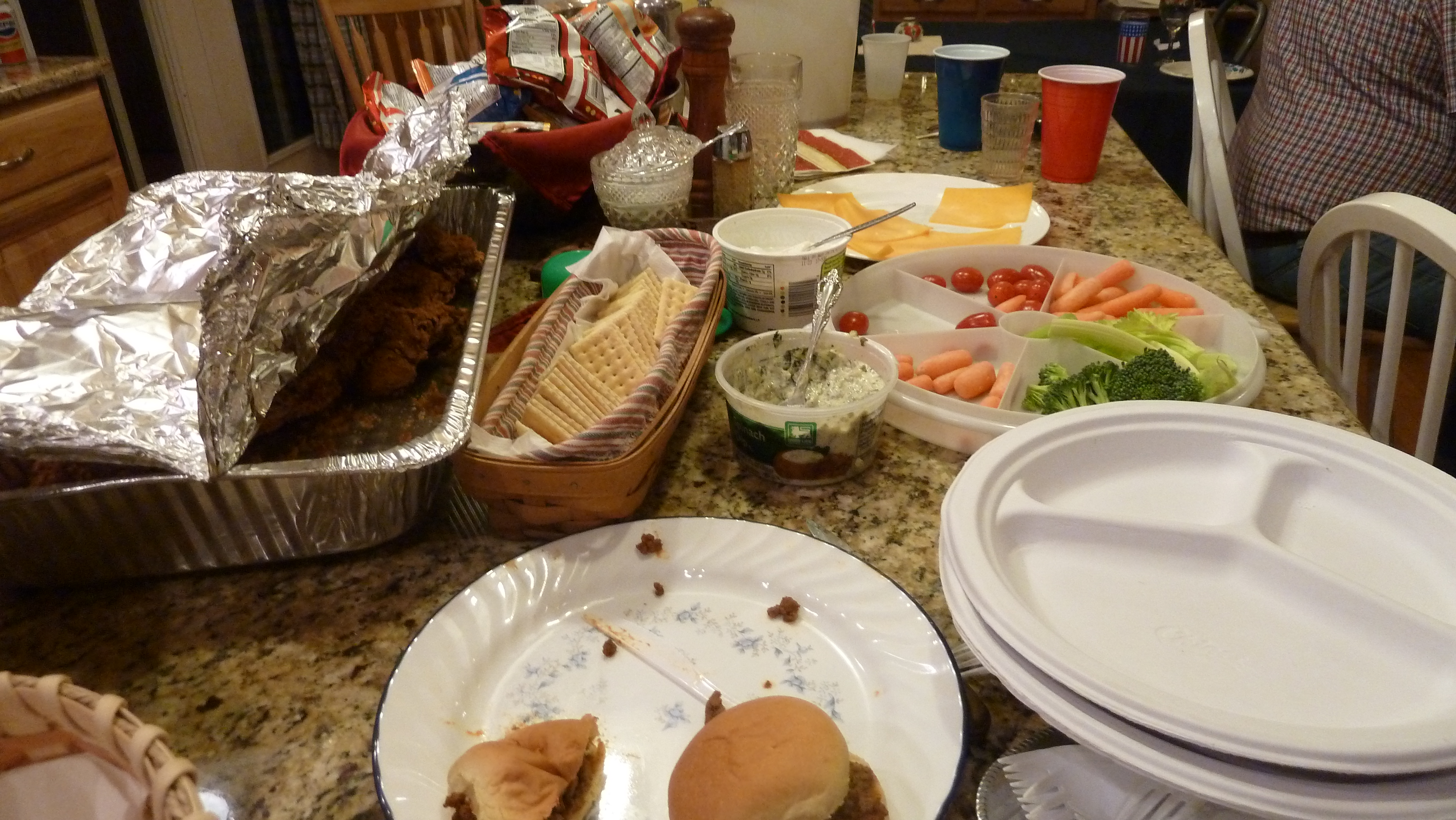 Food. I tried to serve typical lawn party food, adapted to the home scene: barbecues, (fried chicken, no I didn’t fry it myself), chips (instead of French Fries), soft drinks—with the addition of veggies and cheese which you would never find at a lawn party but, well, there had to be something a little nutritious! There was not much left at the end of the evening.
