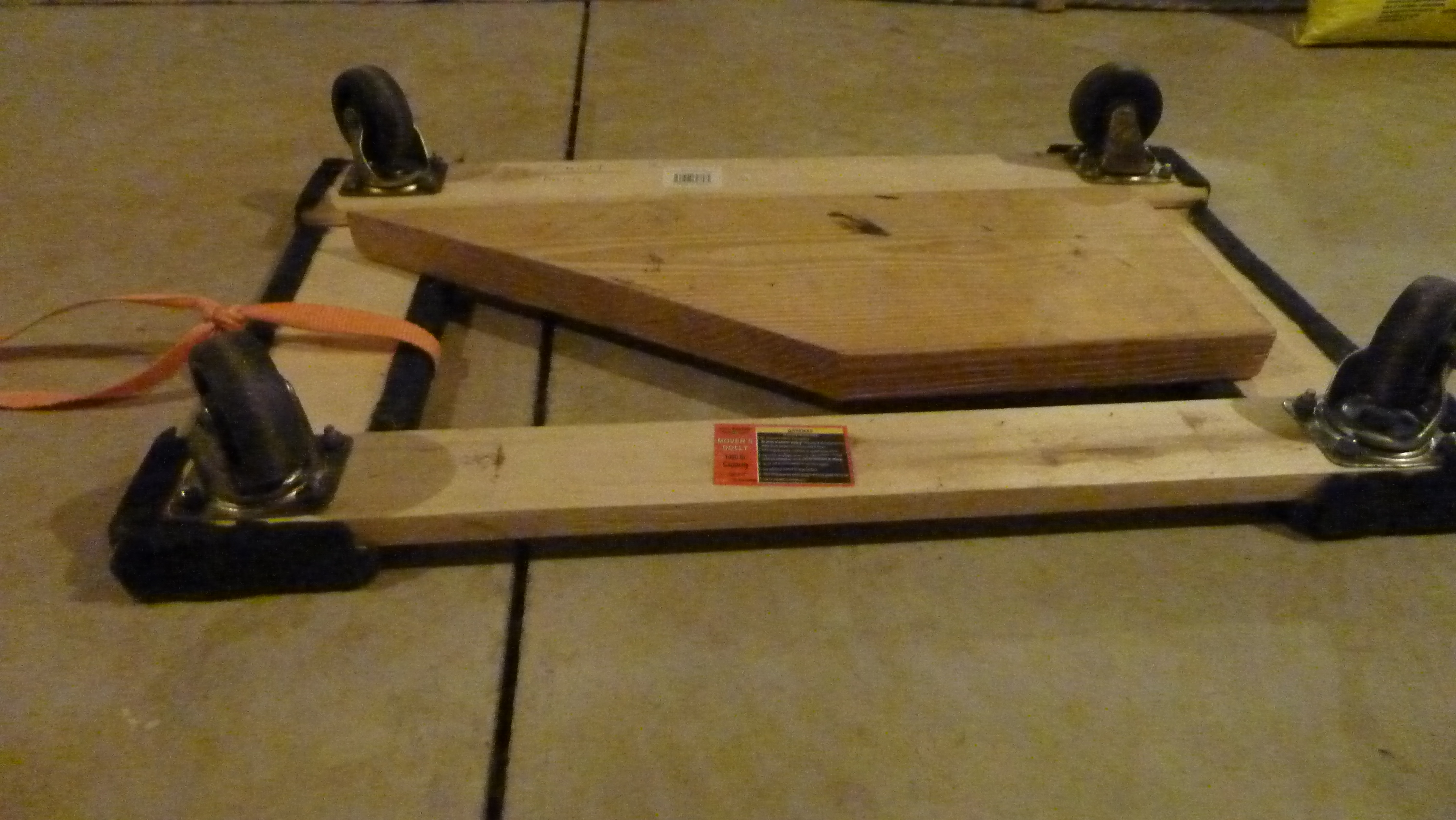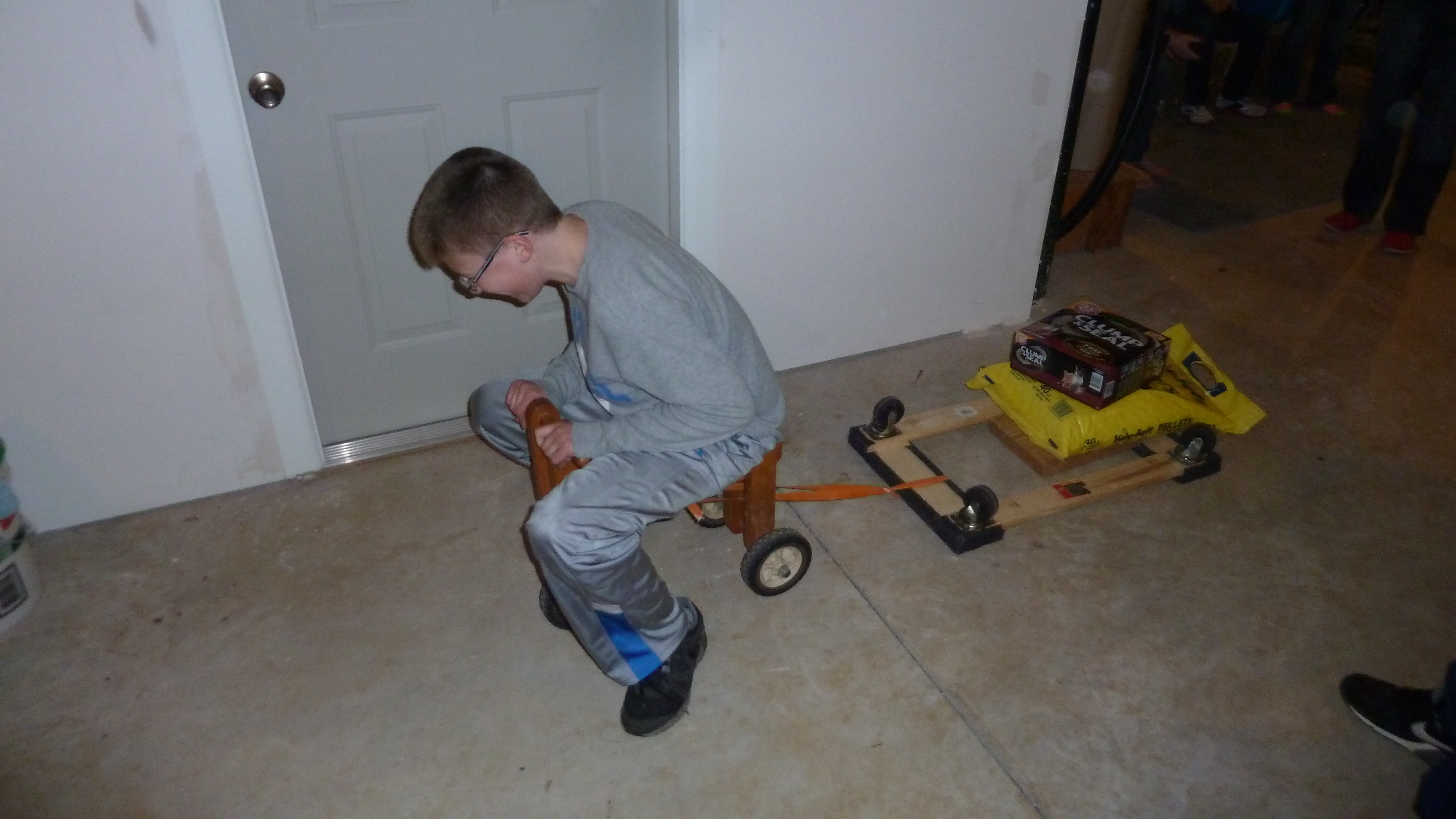 Our “sled” was an upside down dolly, the “track” was two lines in the basement cement, and we added resistance with increasing weights—up to 70 pounds.