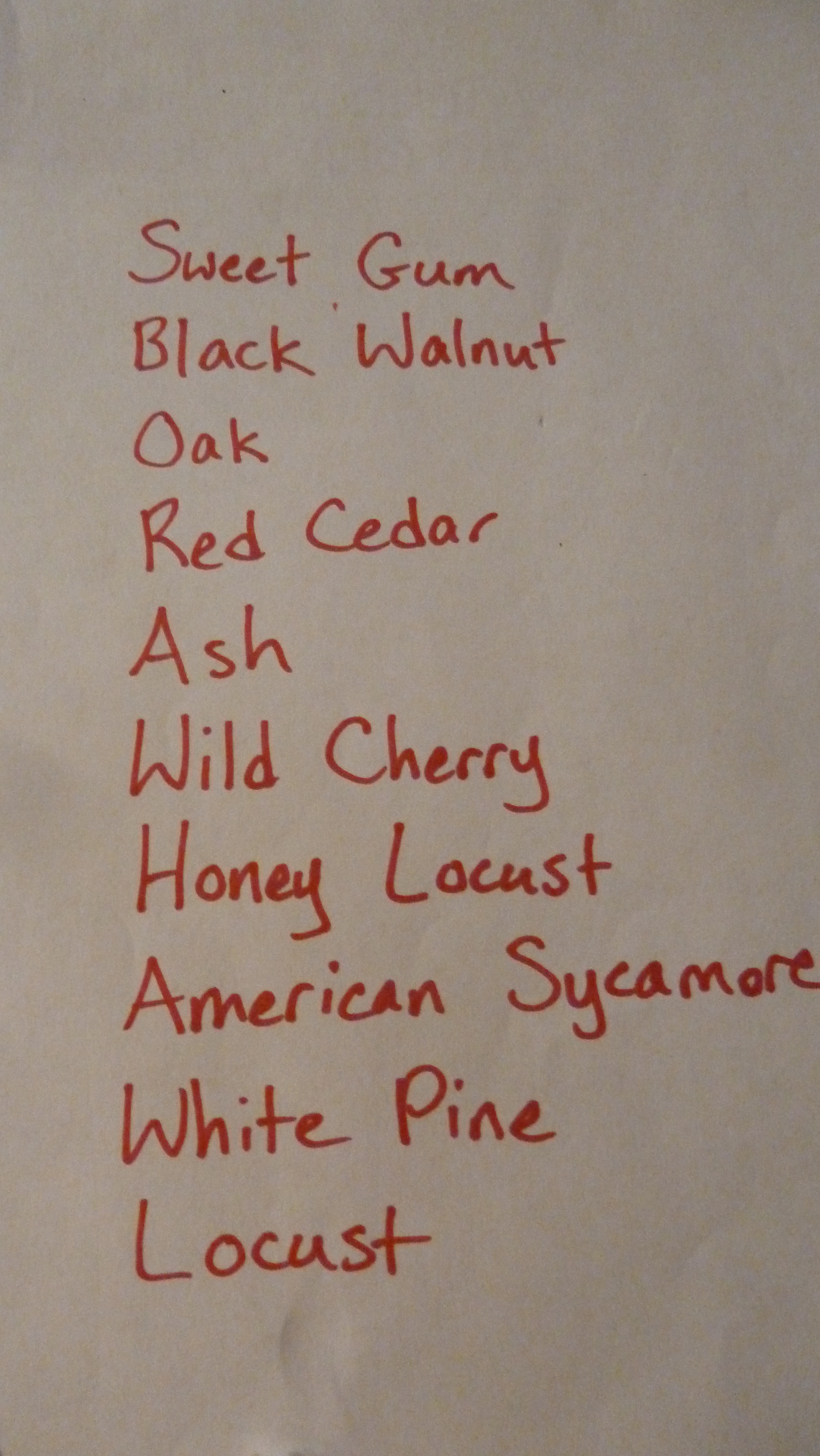 Log Guessing Game. I’ve never seen this at a lawn party, but taking my husband’s affinity for cutting wood, burning wood, and frequently expecting that his daughters and I just “know” the different types of wood as well as he has come to know them over the years, we came up with 10 samples of wood growing on our property and let people do their best guess of which was which, from a multiple choice list. My environmental scientist daughter prepared a careful answer key, also shown below.