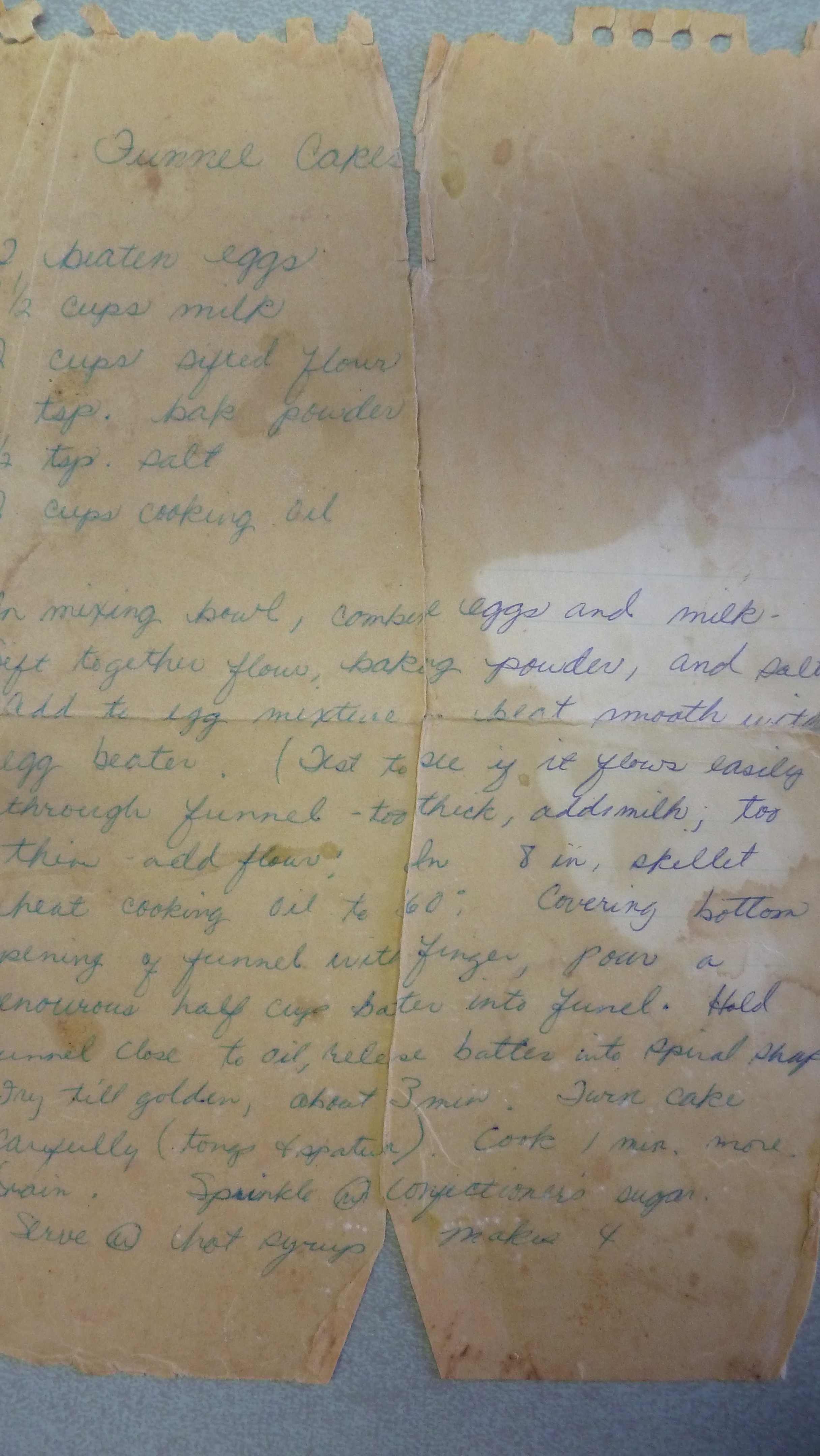 I found the recipe once in a magazine (sorry I didn’t write down the source) but my paper, as you can see, has now come apart (time to write it up fresh, but now it will at least be online). I Googled funnel cakes and there are of course a lot of recipes out there. My recipe does not use sugar (other than to sprinkle on top) or butter so that cuts the richness just a bit. And some of them talked about using a skimmer so I actually went out and bought one thinking it might make turning the funnel cakes a little easier, or at least lifting them up out of the hot grease. Meh, it worked only so so for this operation.