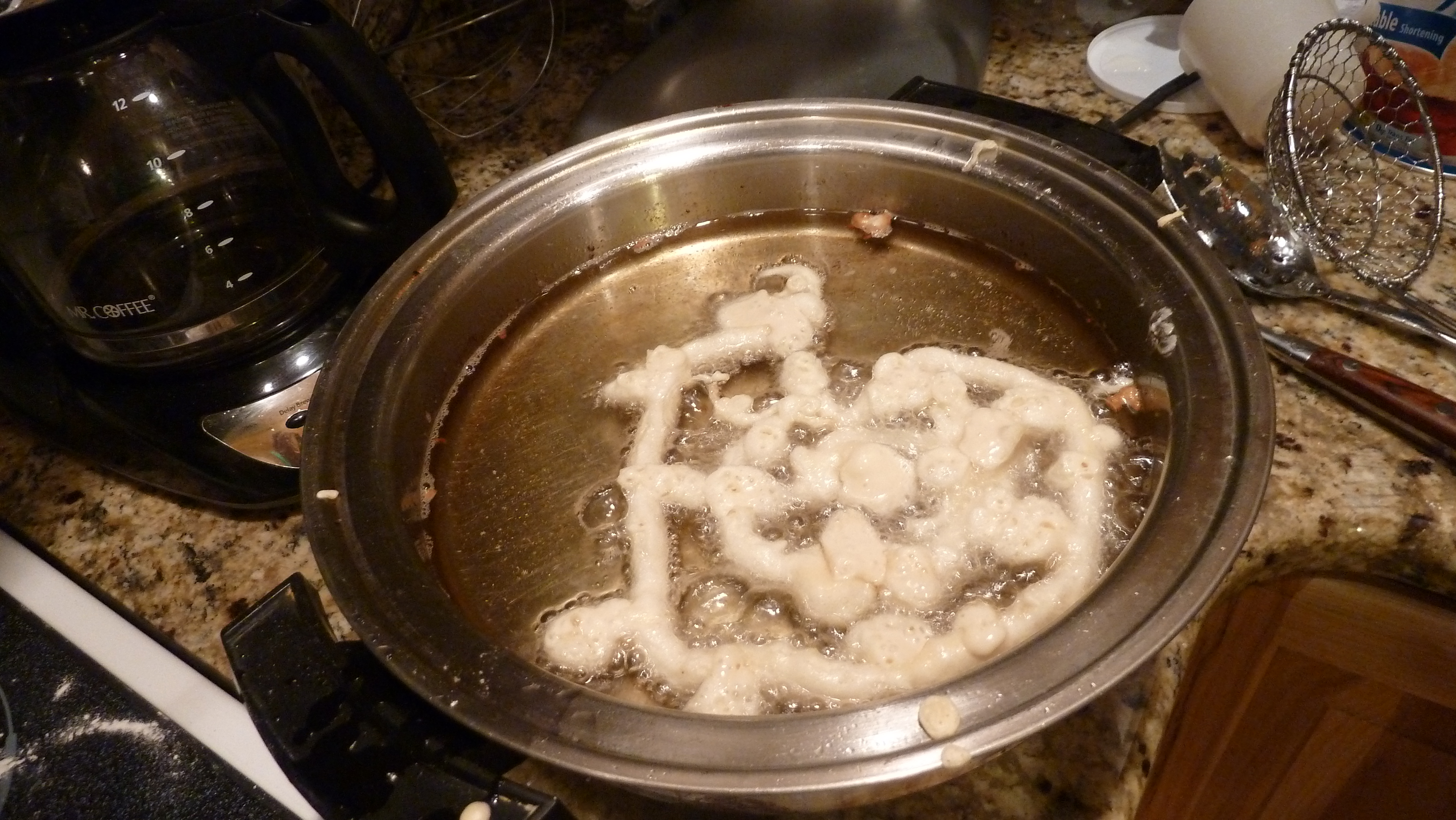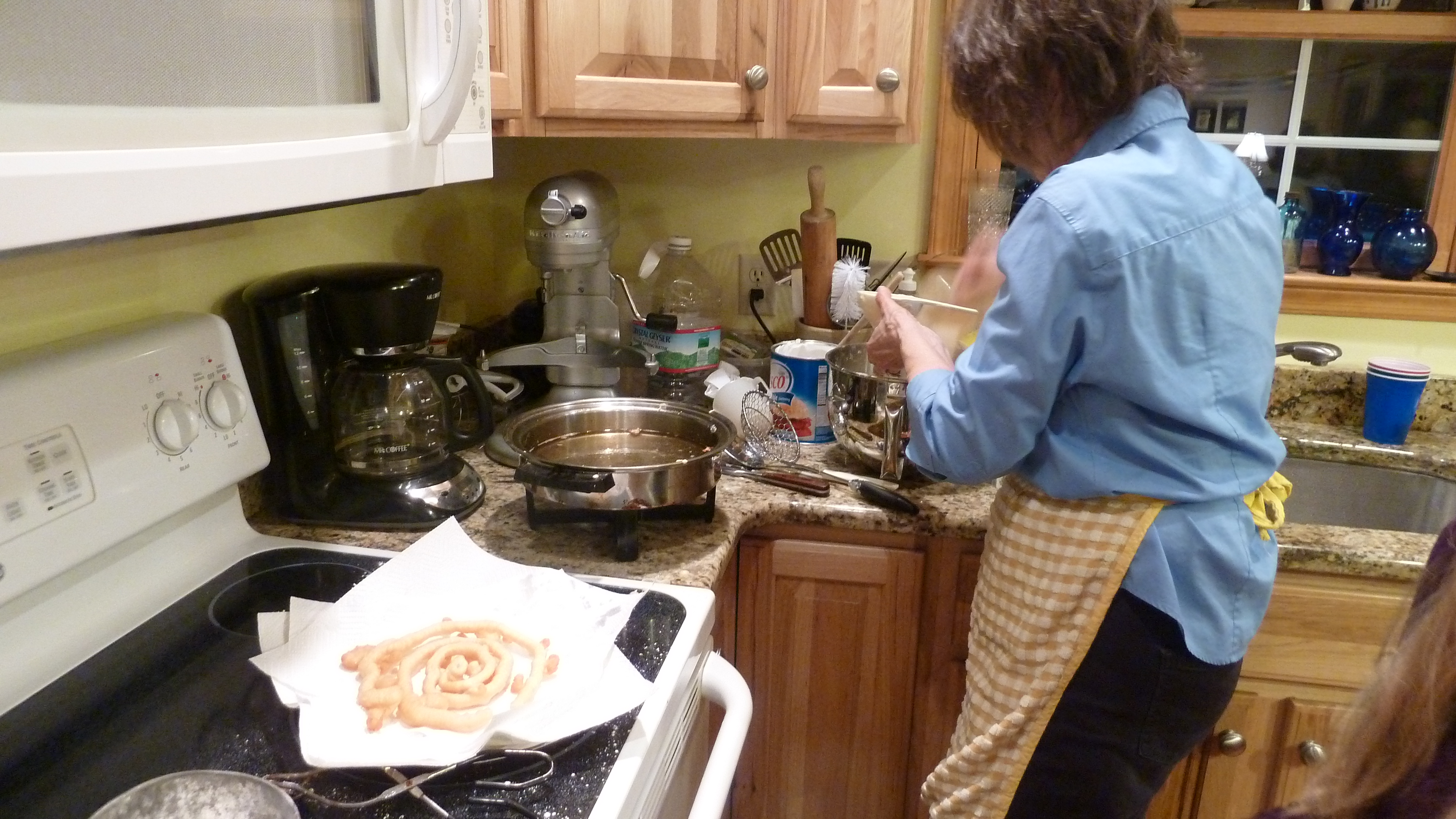 This was a family tradition on holiday mornings when no other big activity was planned: my husband’s extended family used to have their Thanksgiving meal the evening before because of hunters in the family, and so we never had anything special to do on the big day. So funnel cakes for a late lazy breakfast were a fun tradition, or on other holidays like New Years Day, Memorial Day, Labor Day. You don’t want to do this when you have a lot of other big plans for your morning (like Christmas), because the biggest issue is cleaning up the rather grand mess you’ll make.