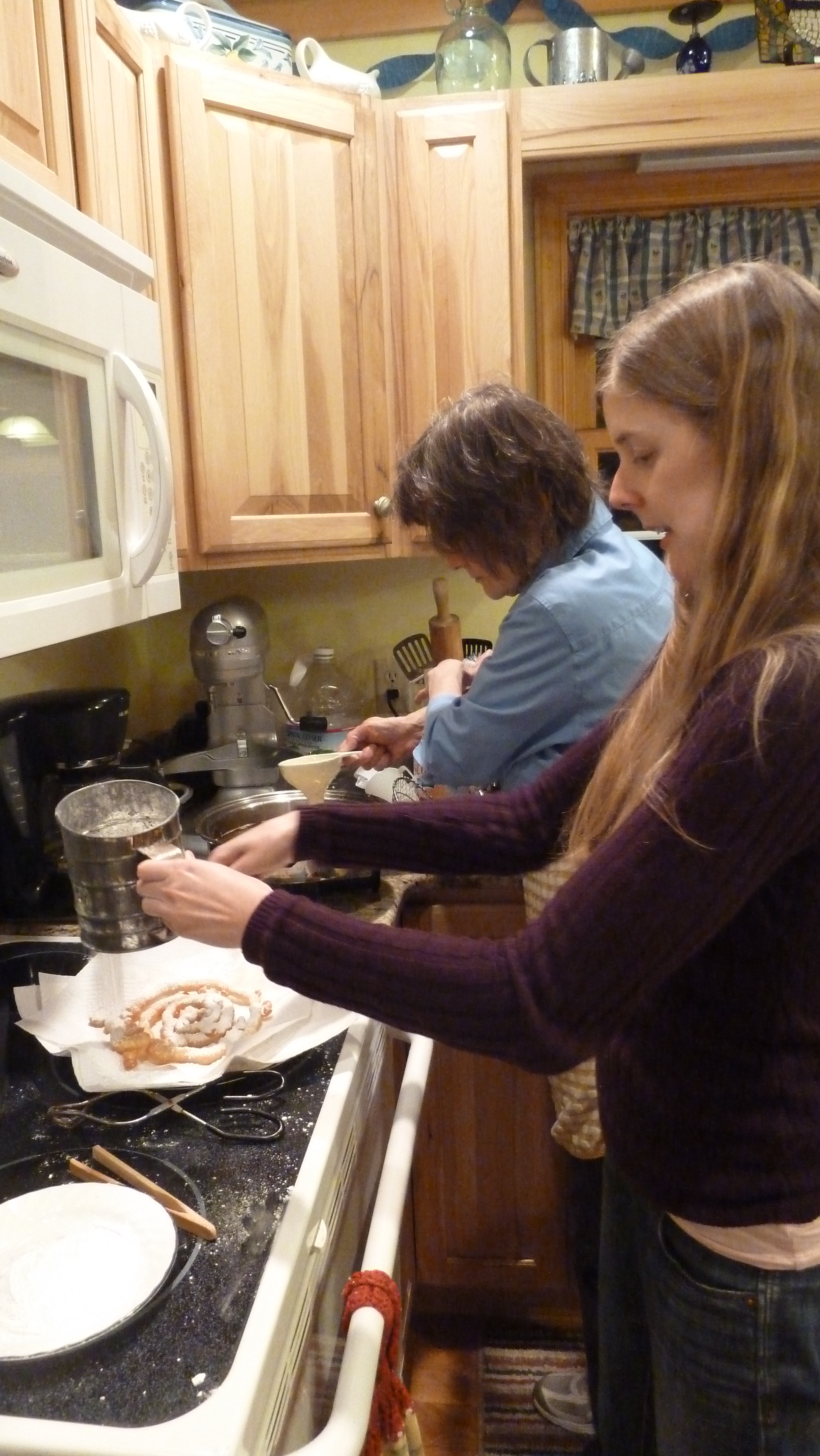 Top: spiral dough in skillet; me using fork to lift funnel cake; daughter sifting confectioner’s sugar.