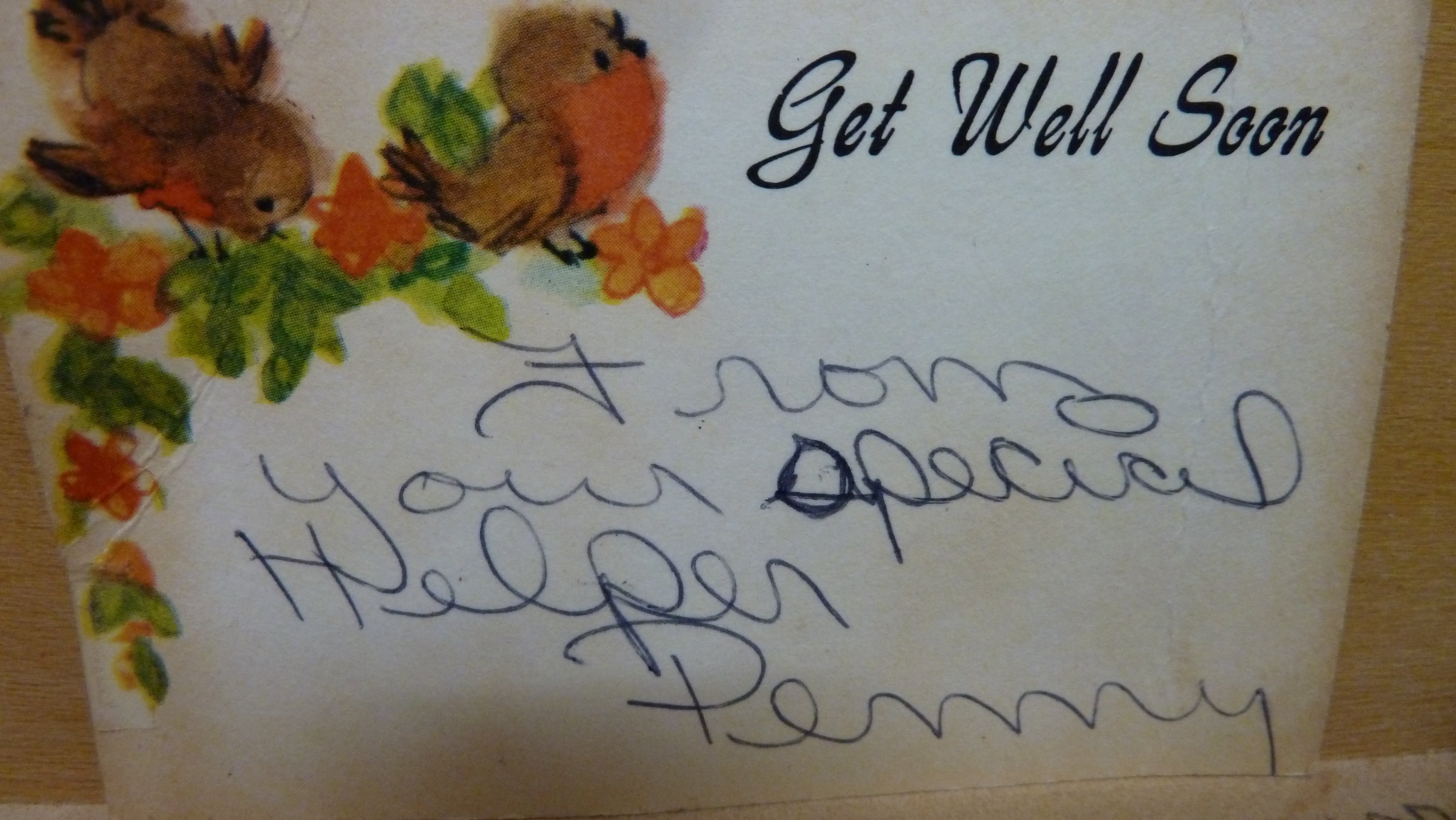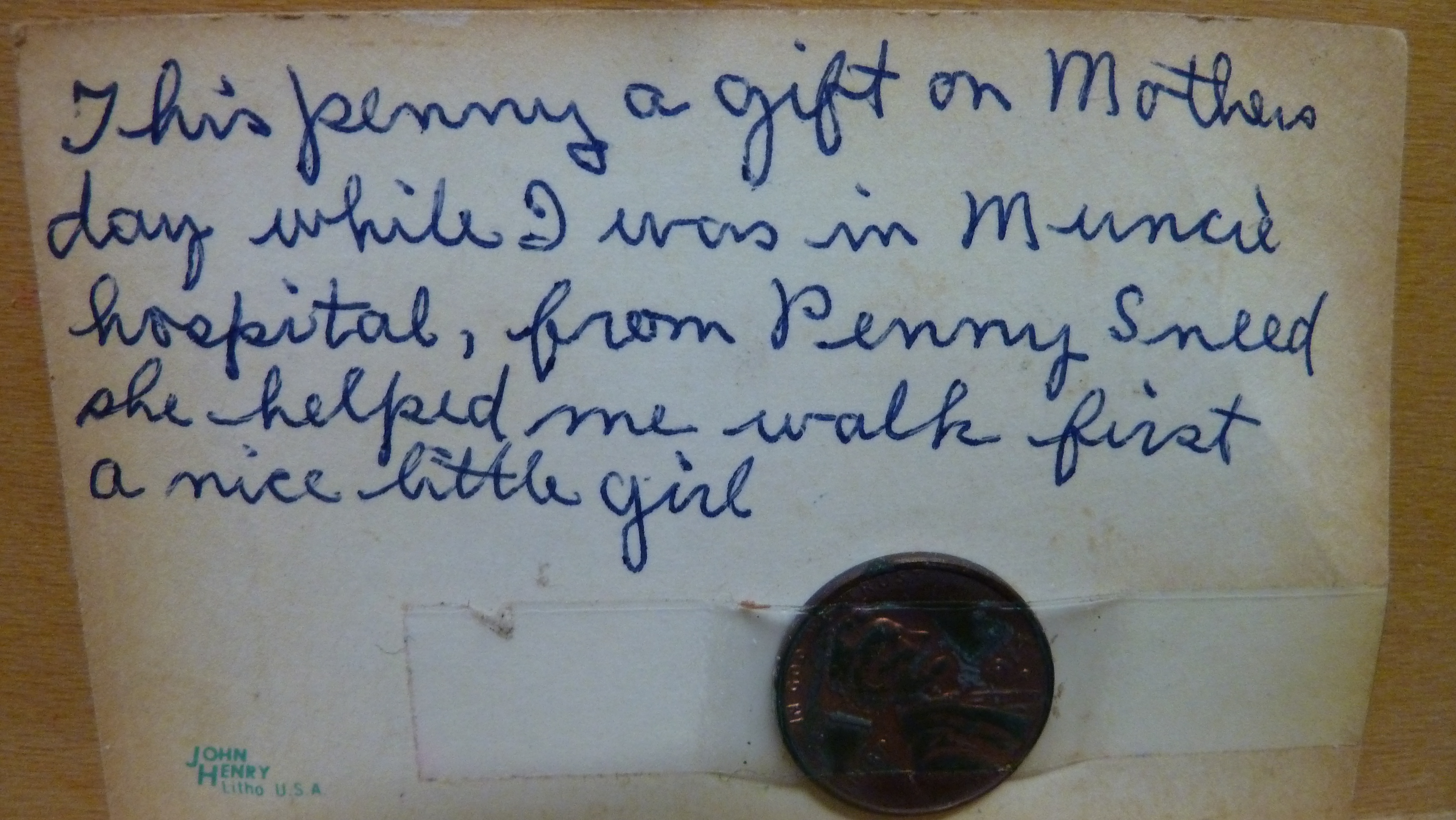 There is also a tiny “Get Well Soon” card such as what would come with a floral gift. It is signed “From your special helper Penny” and on the back Grandma wrote “This penny a gift on Mother’s Day while I was in Muncie [Ind.] hospital, from Penny Sneed. She helped me walk first, a nice little girl.” The penny, taped to the card, was minted 1974.