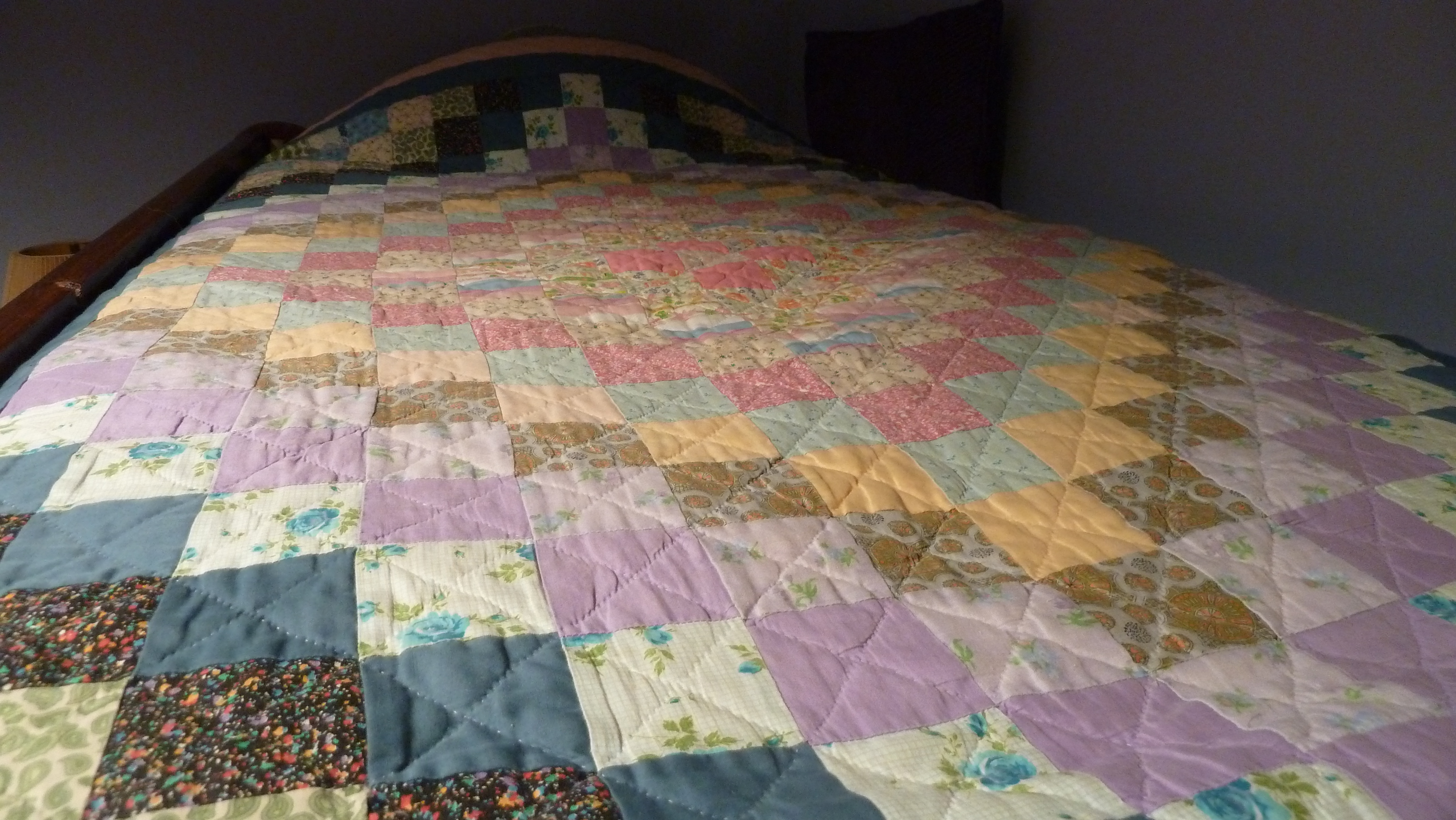 - The time she busied my young children on a visit to her home where they were growing bored and restless and she put them to work cutting out quilt patches for one of her dozens of quilts pieced together over many years. That was Susie at her finest, sensing the boredom of children, and putting them to useful work (that they thought was great fun). I don’t have a photo of that but I do have one of the three lovely quilts that came to my daughters, her grand nieces.