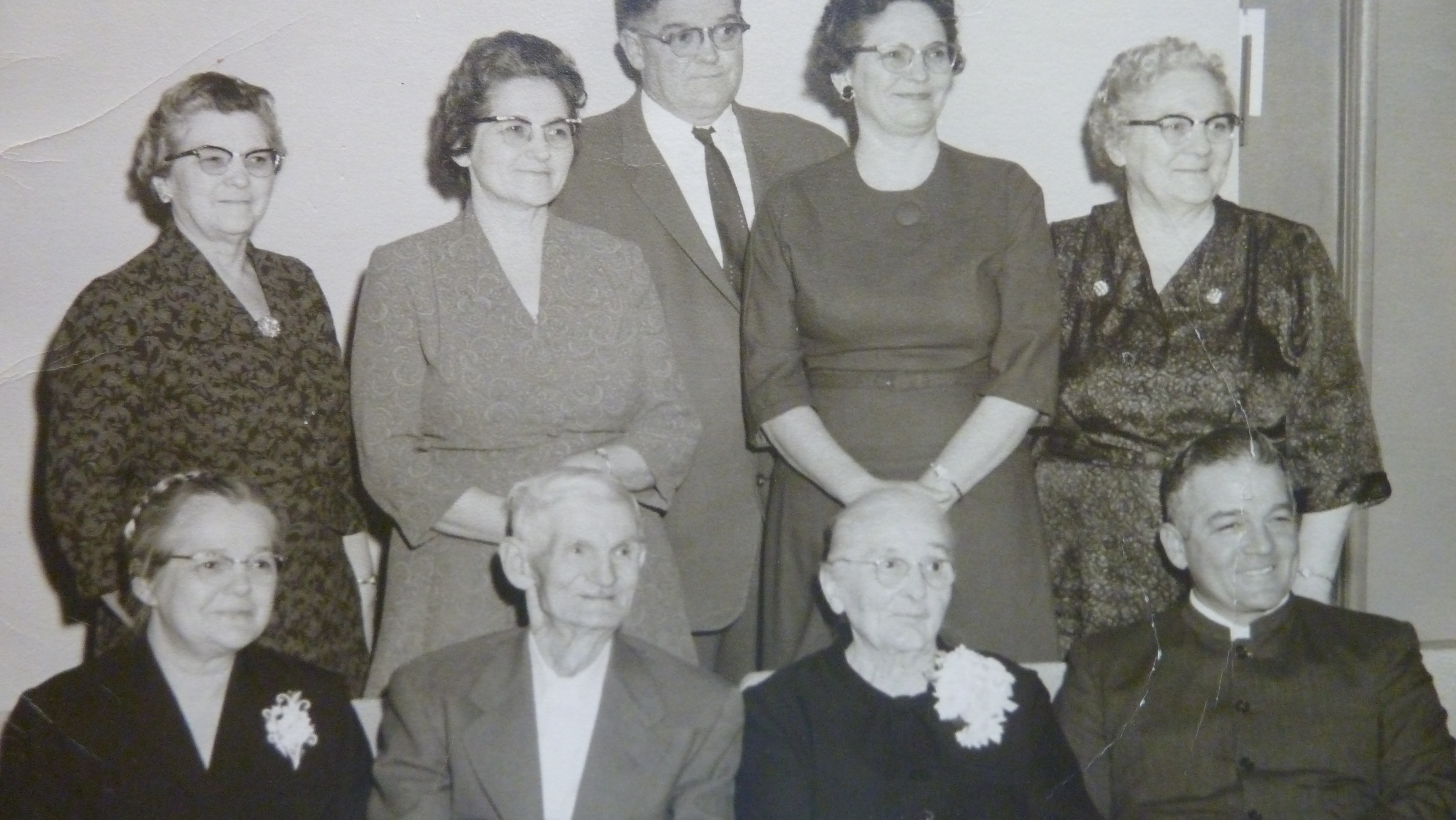 My aunt Susie, bottom left, at Grandpa and Grandma Miller’s (center) 60th wedding anniversary in 1953. My father, bottom right. Back row, l to r: my aunts Adeline, Elnora, Arlene, Irma and back row, Uncle Truman. Note that Aunt Susie was the plainest of my aunts who remained an “old Mennonite” all her life, while my other aunts were in closely related churches but not as plain (note the cut hair hair and earrings on most of my aunts.)