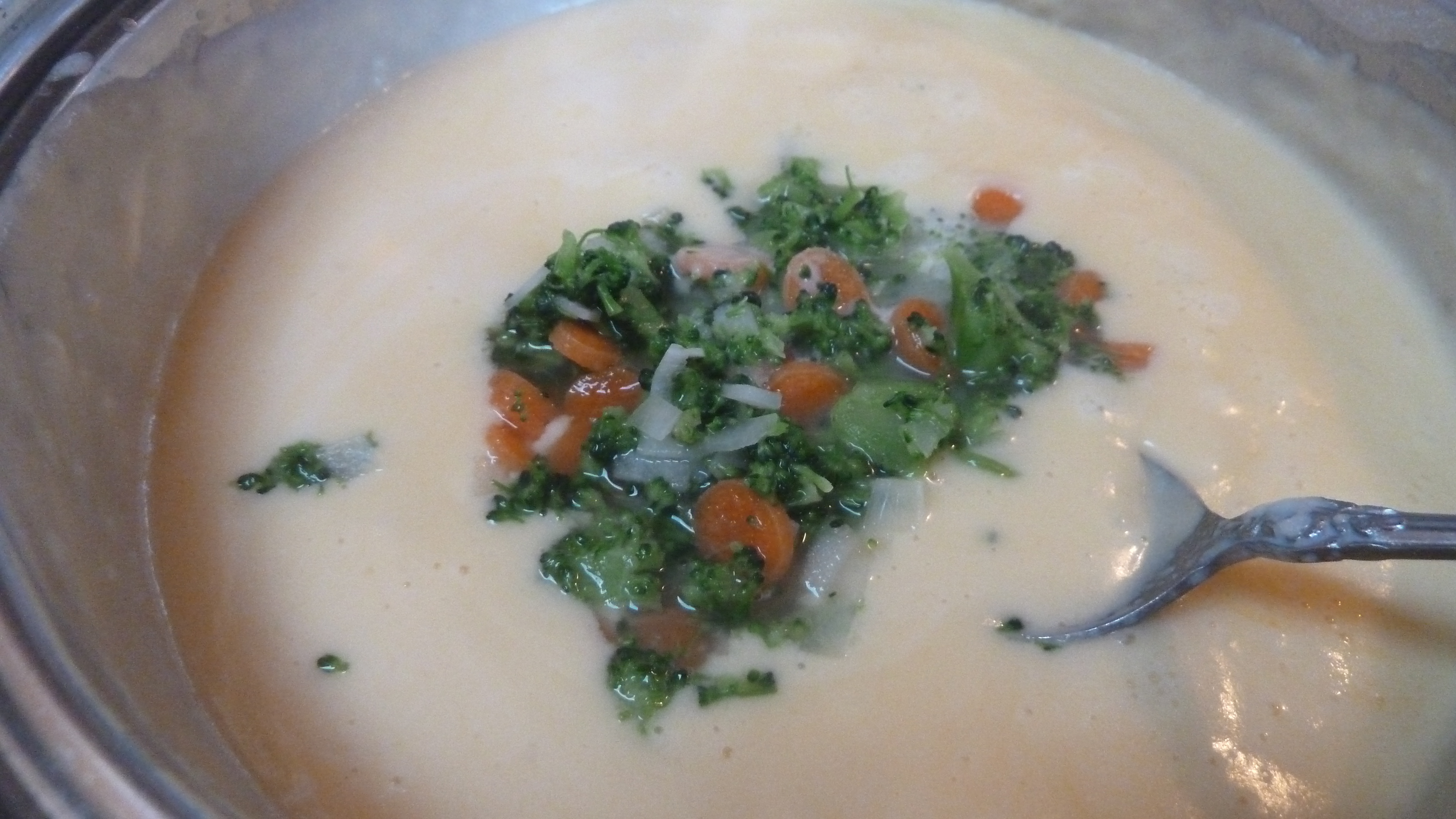 More goodies in the soup: you can also add bits of chopped onion (sautéed or just added in), chopped carrots, cauliflower, potatoes (all of these cooked before you add them), more cheese, different cheeses, crumbled bacon, as desired.