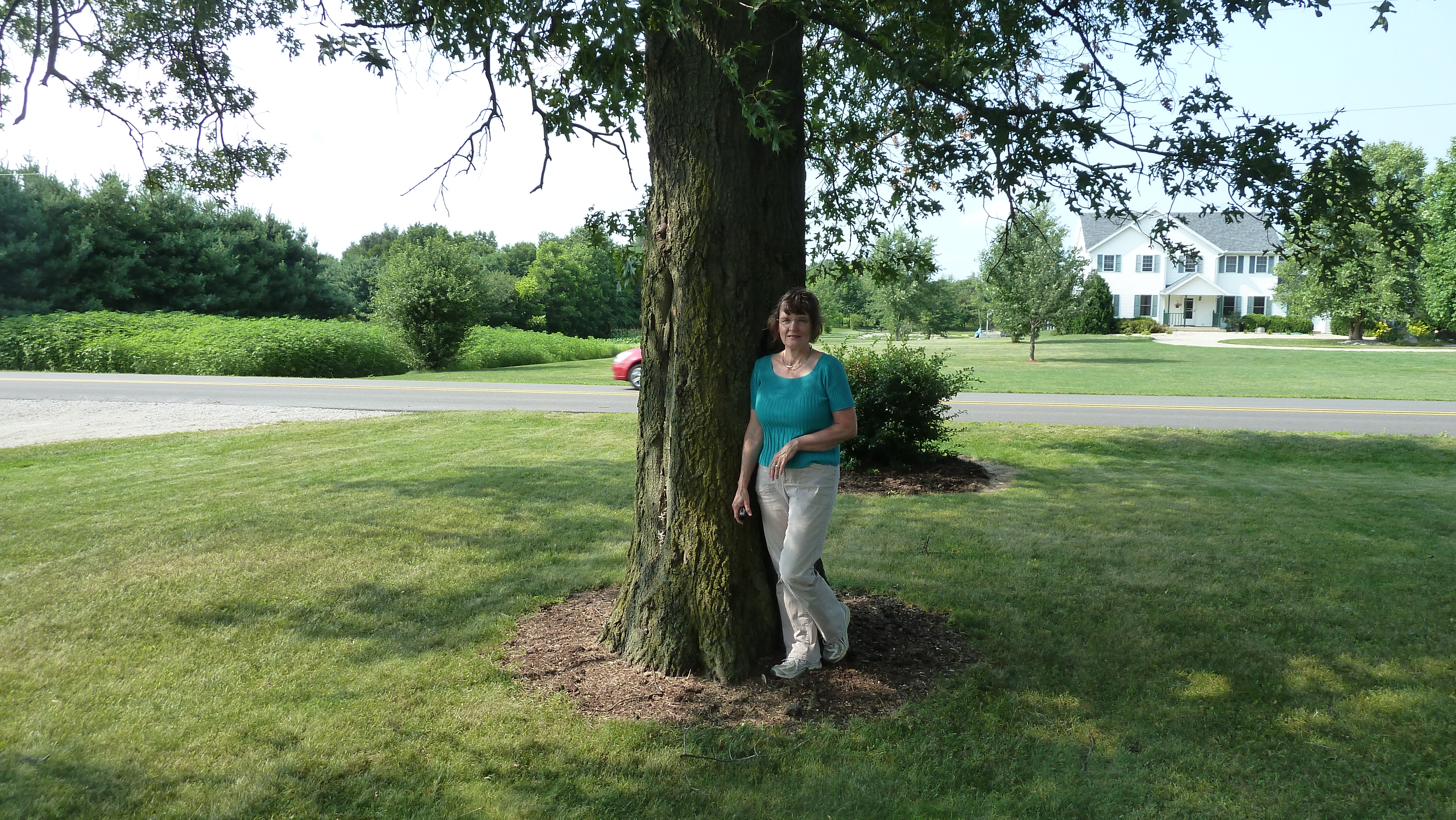 P1060015With the “tiny” oak tree our family planted. We all remember Dad wondering how big it would get to be. It survived a strike by lightning, see slash on the left.