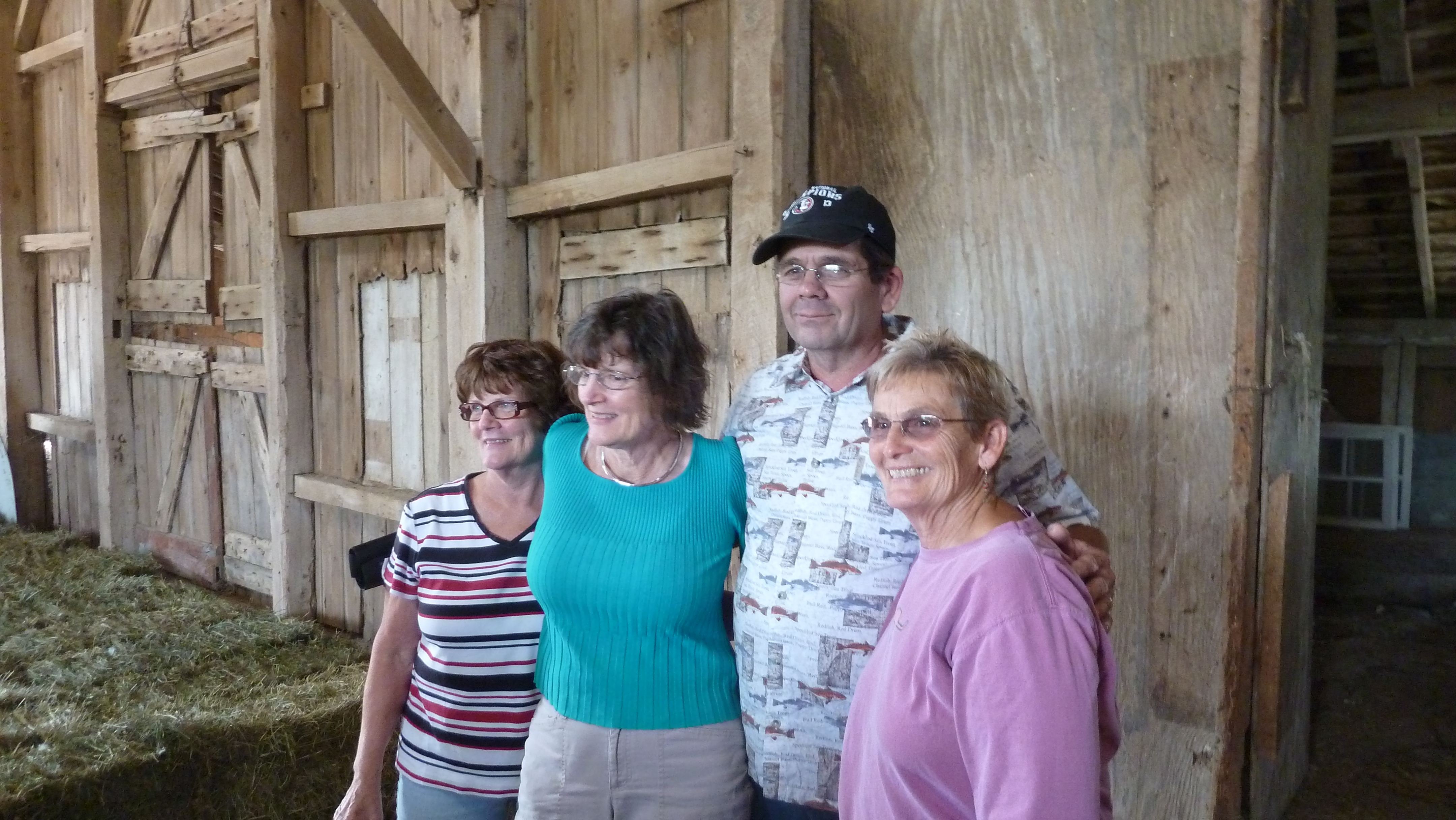 Oh the barn. The silo now gone (the farmer said the extra yearly taxes were too much for something they were no longer using)—we walked up the barn hill which seemed so huge when we were little, now little more than a small rise. Inside it was mostly filled with hay and straw. The granary was still there, the sheep shed still attached, the bunker silo still in use, a square hole for throwing hay down to the floor beneath still gaping and dangerous for the little ones in our midst.
