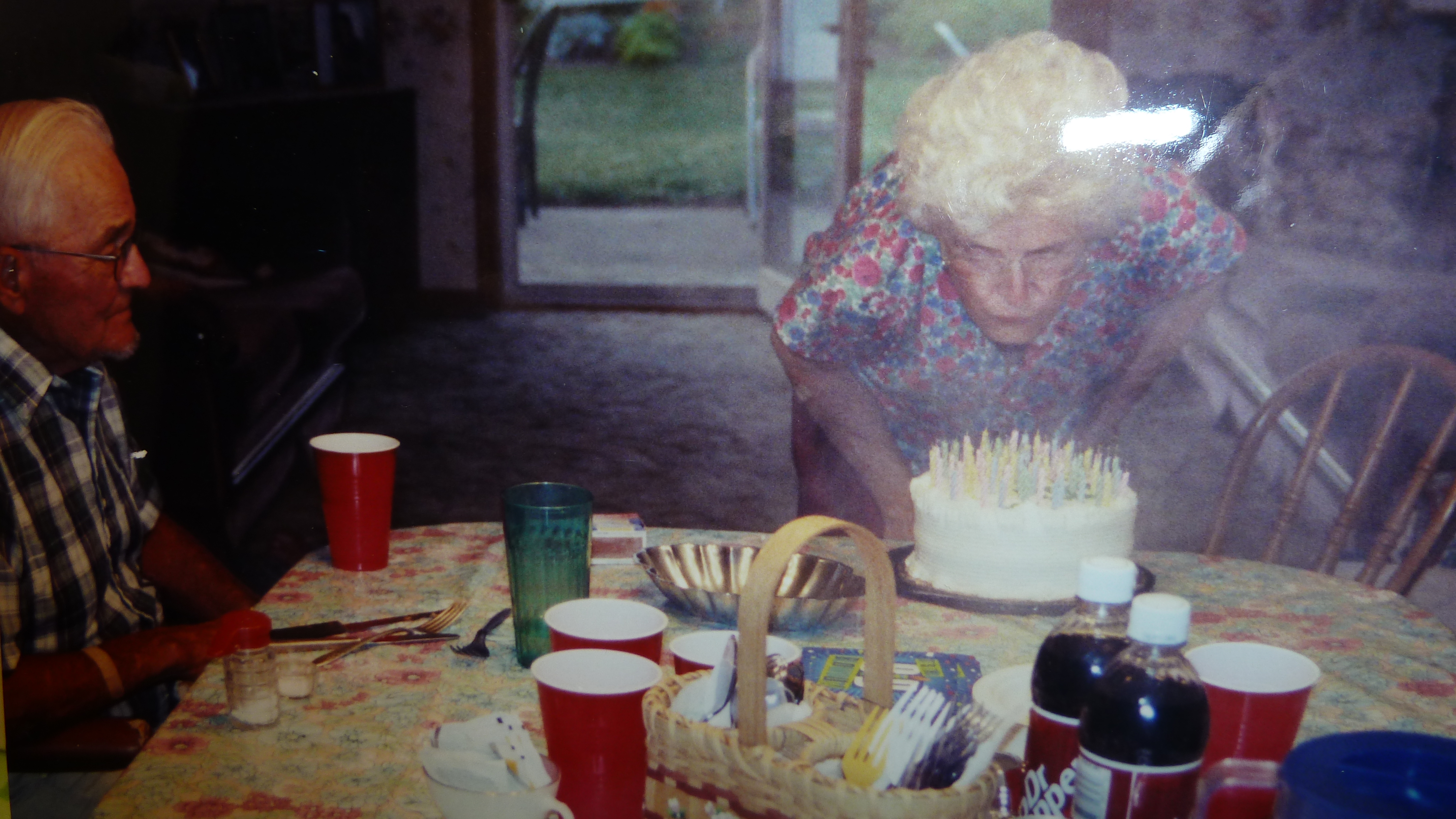 (Dad and Mom look on as grandchildren Michelle, Doreen, and great grand Brittney, light 80 candles at Mom’s 80th birthday, 2004)