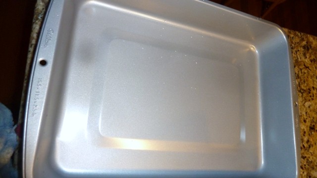 Indeed it was a huge amount of batter, needing an Amish family-size mixing bowl, my quart sized measuring cup and an 11 x 15 inch baking pan. When I asked at the office whether anyone had an 11 x 14/15 inch pan, no. So I went to Bed, Bath and Beyond which did have one (for a huge lasagna pan) and I could imagine several uses for it in the future so, uncharacteristically for me, I bought one. (Slow to purchase new gadgets or kitchen items for myself: I even put spatulas and potholders on my Christmas list.)