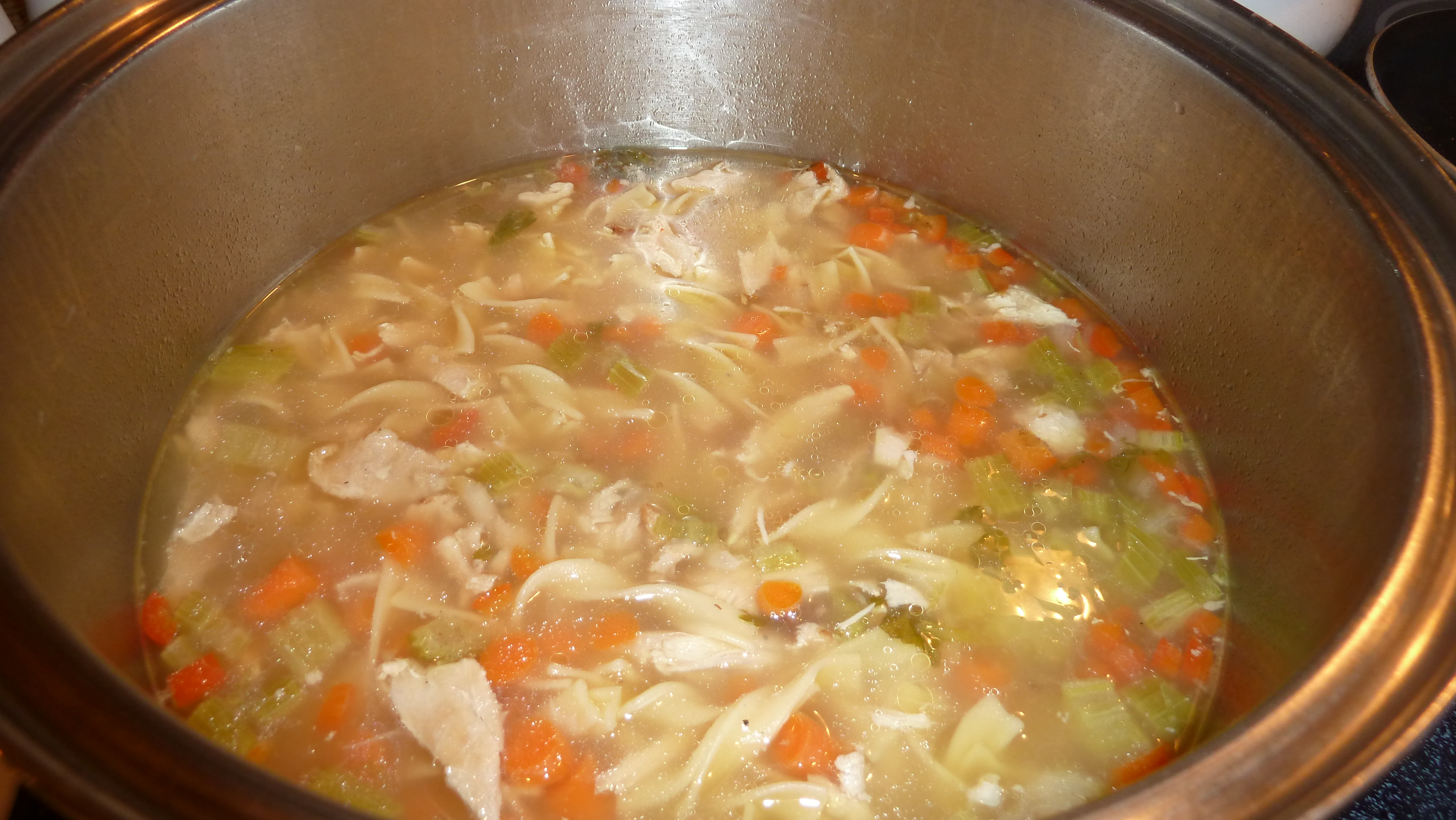 Leaving broth in the pan, add chopped turkey, other broths according to how liquidy you like your soup, noodles, celery, onion, red pepper, carrots plus seasonings. Bring to boil. Turn to simmer and cook for about ½ hour.