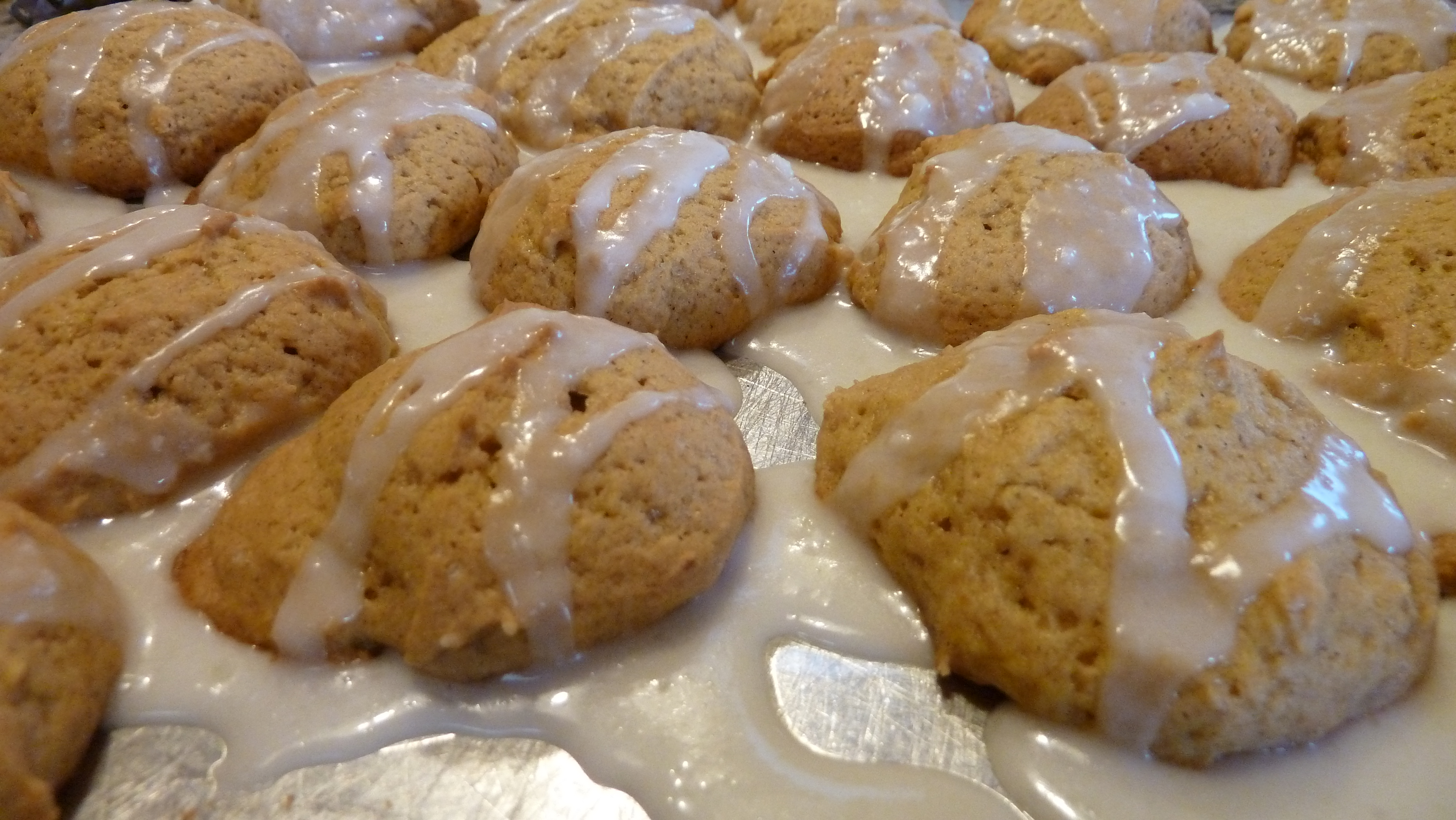 The recipe I chose makes cookies that are not terribly rich, have some Vitamin A value with all that pumpkin in them, and only use a cup and a half of sugar (while most cookie recipes call for two). I made some without frosting for the about-to-be-one-year-old. Surely his mother would not object??