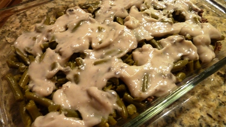 TaterTotCasseroleEdited2(Spread mushroom soup over layer of hamburger and green beans. Kind of patchy, but it spreads out in cooking.)