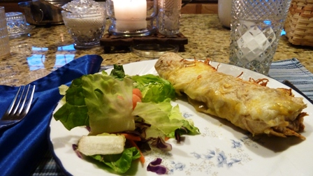 Spoon 1/2 cup bean/chicken mixture down the center of each tortilla. Roll up and place seam side down in a greased 13-in. x 9-in. baking dish. (In this case I was using one larger and one smaller pan; the larger dish to share with another couple, and the smaller dish for my husband and me.)