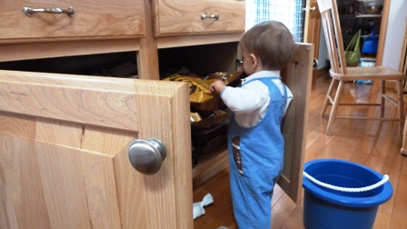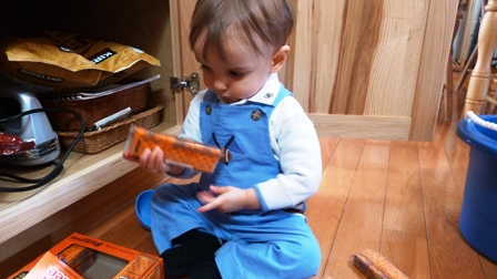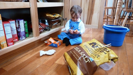 These two toddlers have just recently really taken off on their walking skills, but on this afternoon, as I’m working on various dishes for my husband’s smallish birthday dinner, James takes up camp near a relatively safe cupboard collection of cereal boxes, chips, canned goods and odds and ends.