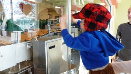 First off to Krispy Kreme for marvelous, fresh, worth-every-calorie hot donuts, with his parents carefully pinching off the sugary stuff and just letting Sam have the inside bready part.