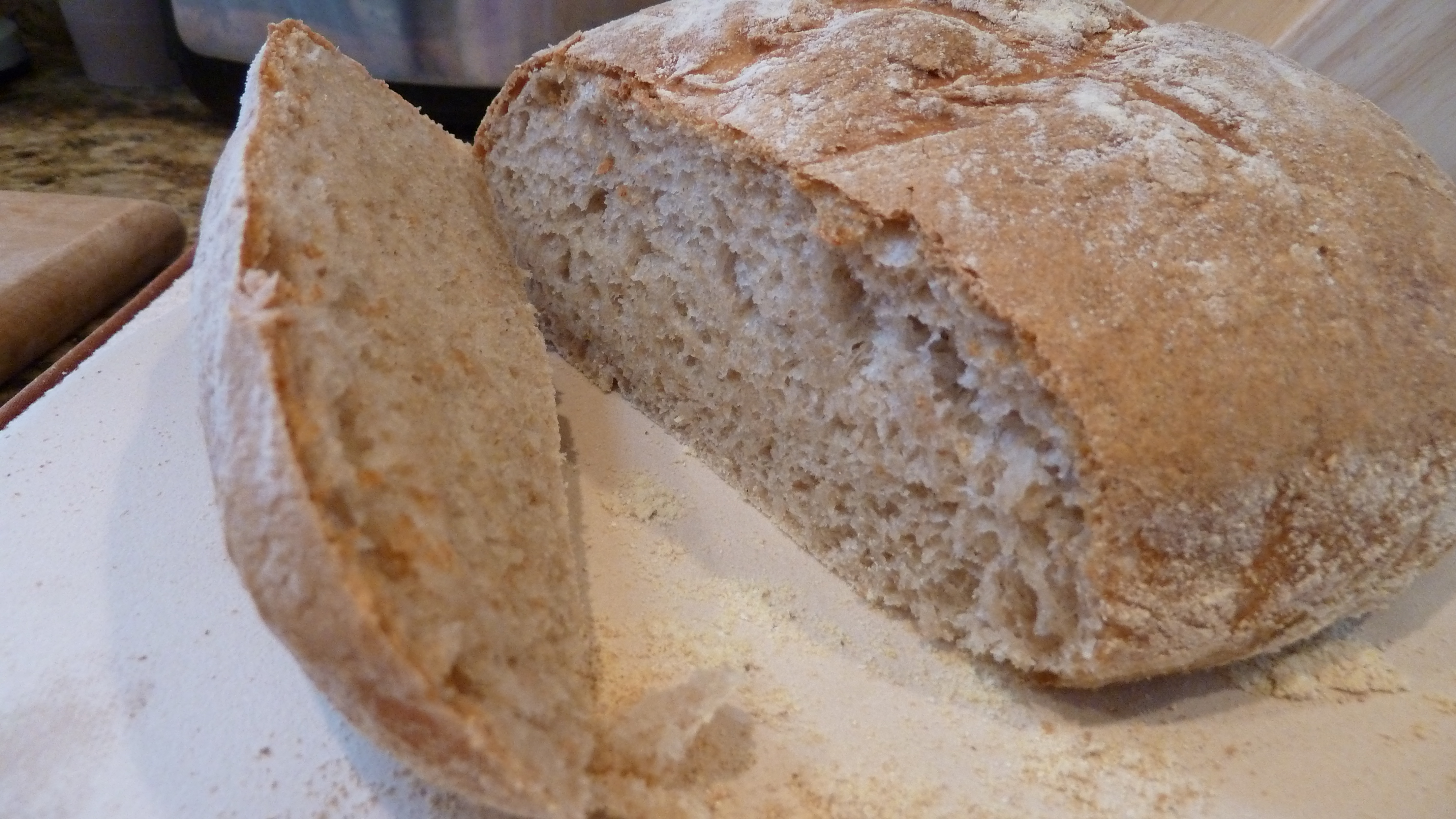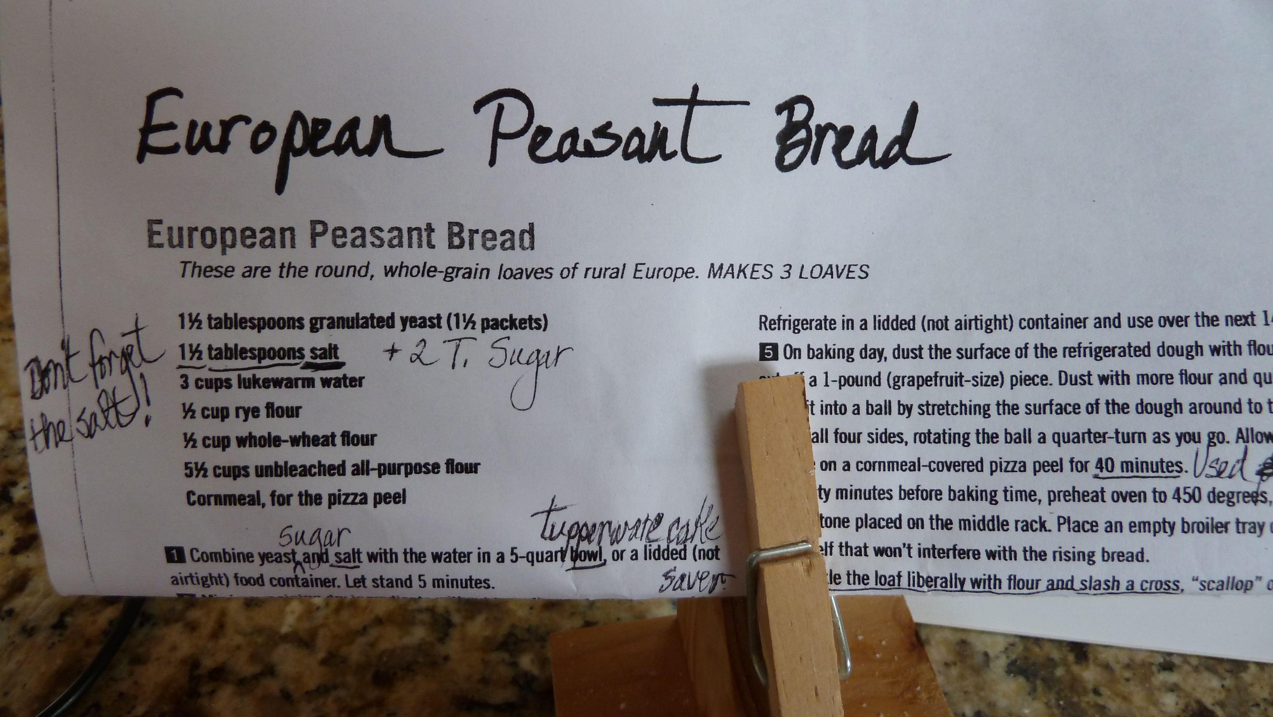 My friend Janet brought a tasty/crusty loaf of bread to our house church potluck a while back and shared the recipe when I asked. But it took me forever to get around to trying it, because I first had to acquire a stone, which I received for Mother’s Day last year. (I get the impression that most cooks under 40—at least if they are into cooking and baking at all—pretty much consider a stone to be an essential piece of kitchen equipment.) I also had to pick up some rye flour for this recipe (a huge bag from bulk food store that I promptly split with Janet).