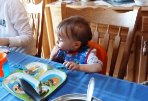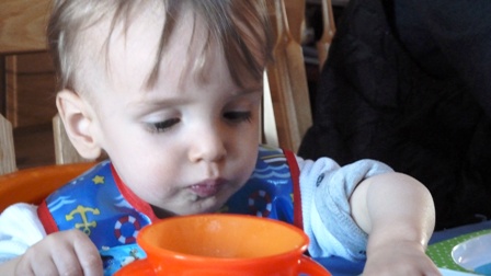 Some of their dinner is shredded, for tiny teeth; the 16-month-old has 6 teeth, the 18 month only has 1, although the 2nd tooth is budding! (Can you see it below?)