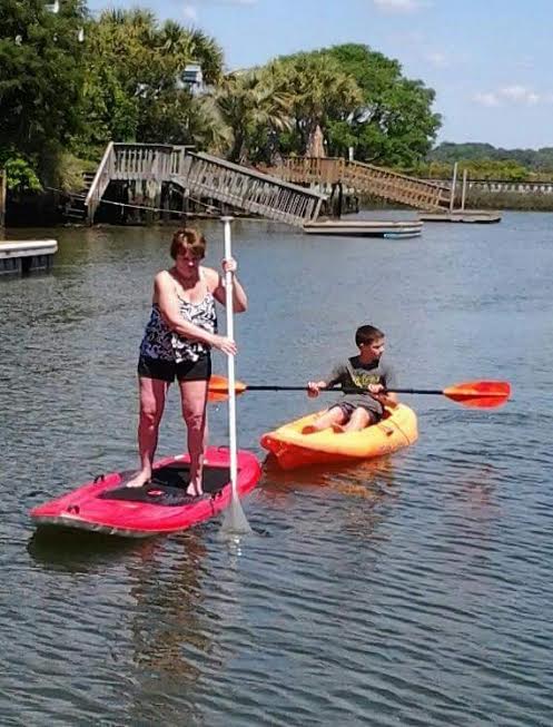 Oldest sister Nancy on the paddleboard, with her grandson, Stone, backing her up. Yay Nan!