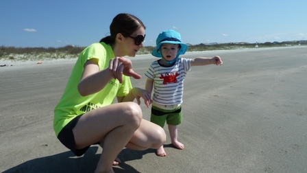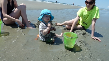 Our beach party included a pair of precious one-year-olds, two kids newly in double digits, some 20- and 30-something young adults, a late-30s dad, and us older ones, all making tracks and memories in the sand. In my previous beach post, I said I did not expect to go in the ocean much over my ankles, it being the first couple days of May in North Carolina, but the sun was warm. Finally I sucked up my breath and rode a few waves and got my hair wet without going under.