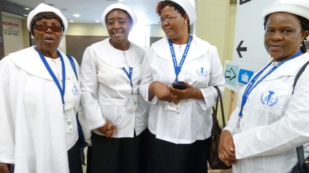 Some new sisters in the faith from Zimbabwe I spoke to briefly and got permission to show their outfits, white blazers and hats–traditionally worn for special church occasions like baptisms or celebrations;