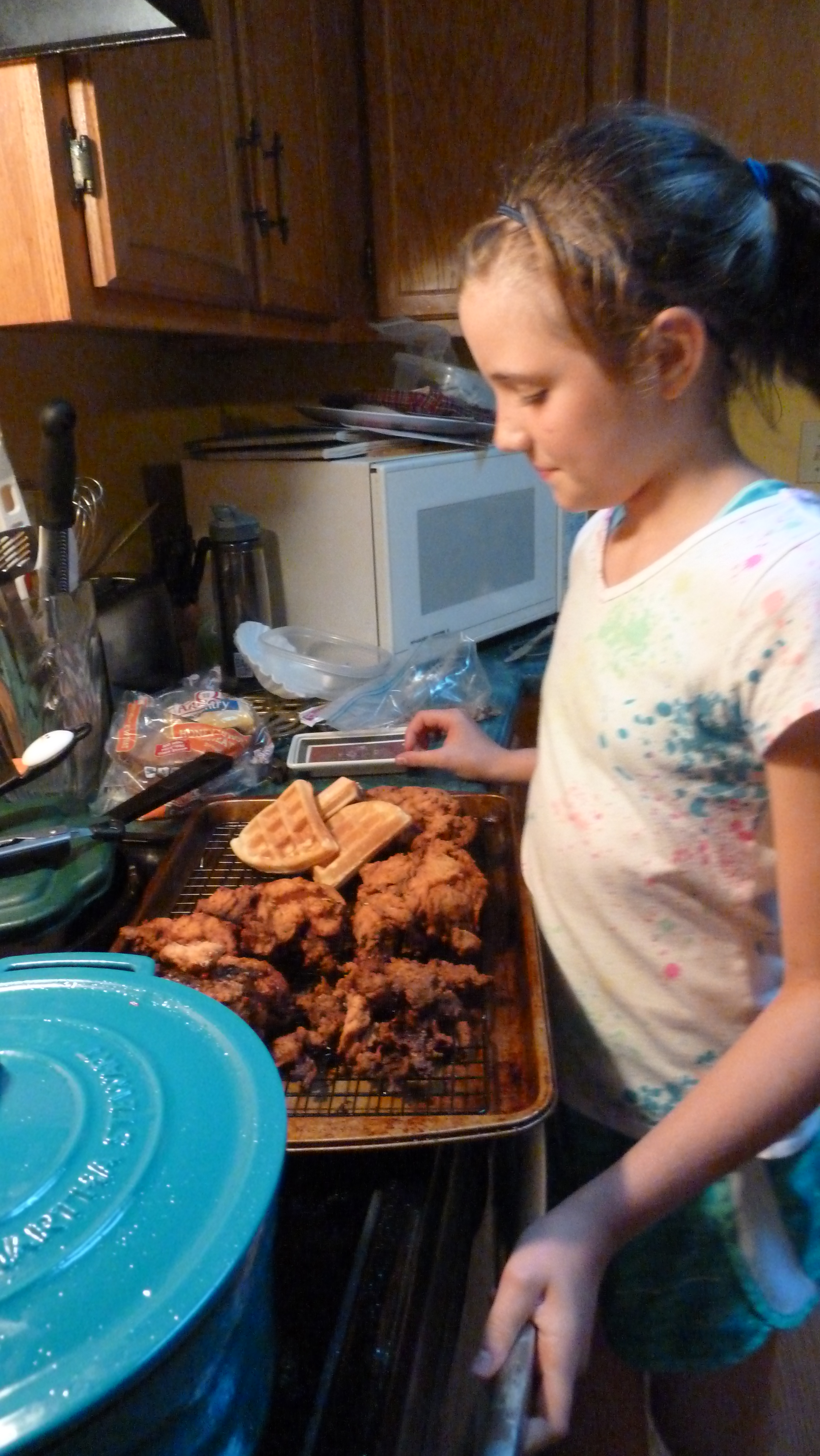 She is 12 years old. Not 42 or even 22. Children today only make cookies and occasional muffins, boxed cakes or scrambled eggs maybe. Right? Not fried chicken, homemade waffles, and salads plus dressing with such a flourish. Or maybe I’m behind the times. At least that was the case when I grew up, and with my own girls. I always felt I did pretty good “letting” them try their hand in the kitchen. But not take over.