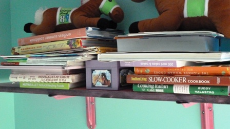 She points out, “Grandma has a whole crate of recipes like this.” Lizzy leads me to her own personal collection of cookbooks she keeps on a shelf in her neatly straightened bedroom.